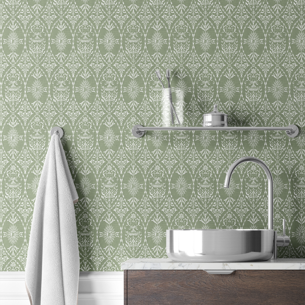Elegant sage green damask pattern with vintage heritage motifs on a textured background, perfect for sophisticated home decor.