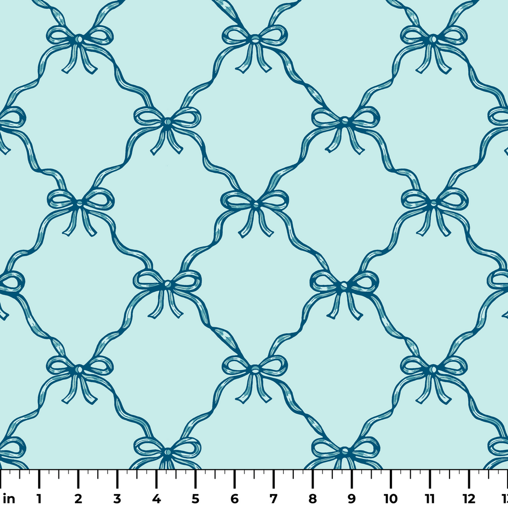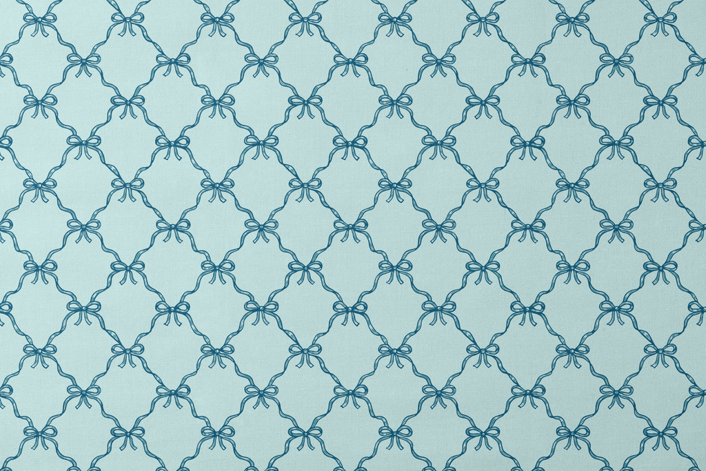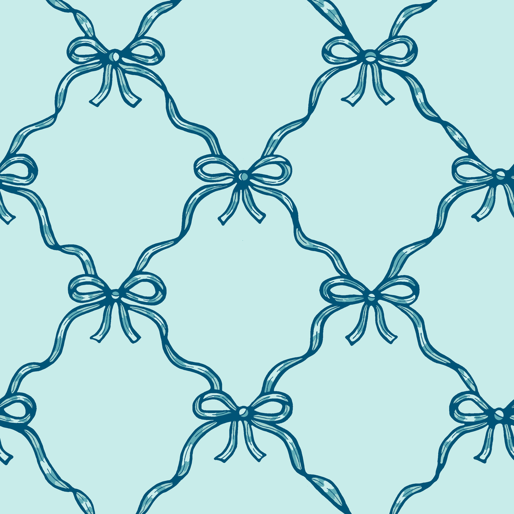 Elegant blue ribbon bows create a timeless lattice pattern on a soft turquoise background. Perfect for craft, apparel weddings, or sophisticated home decor.