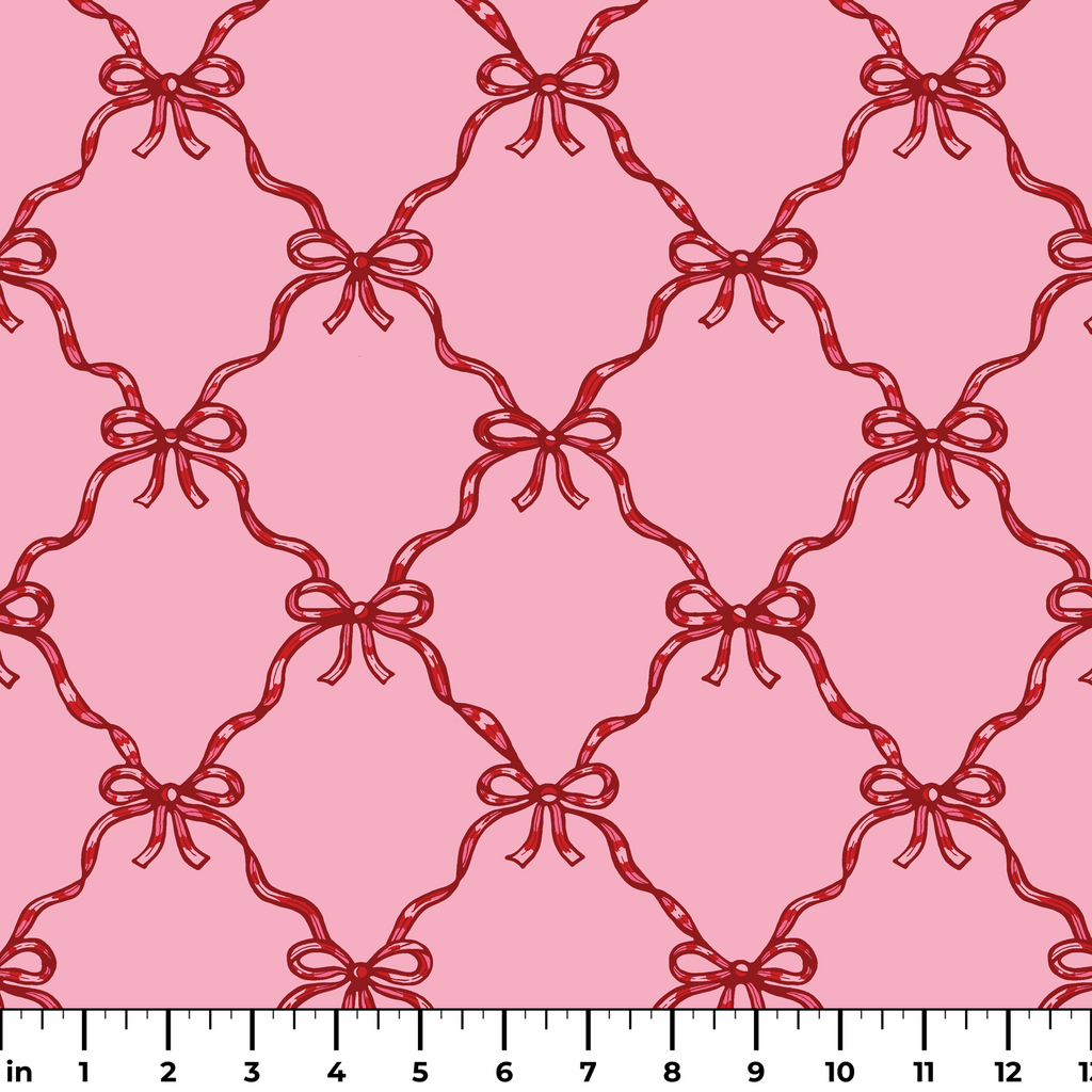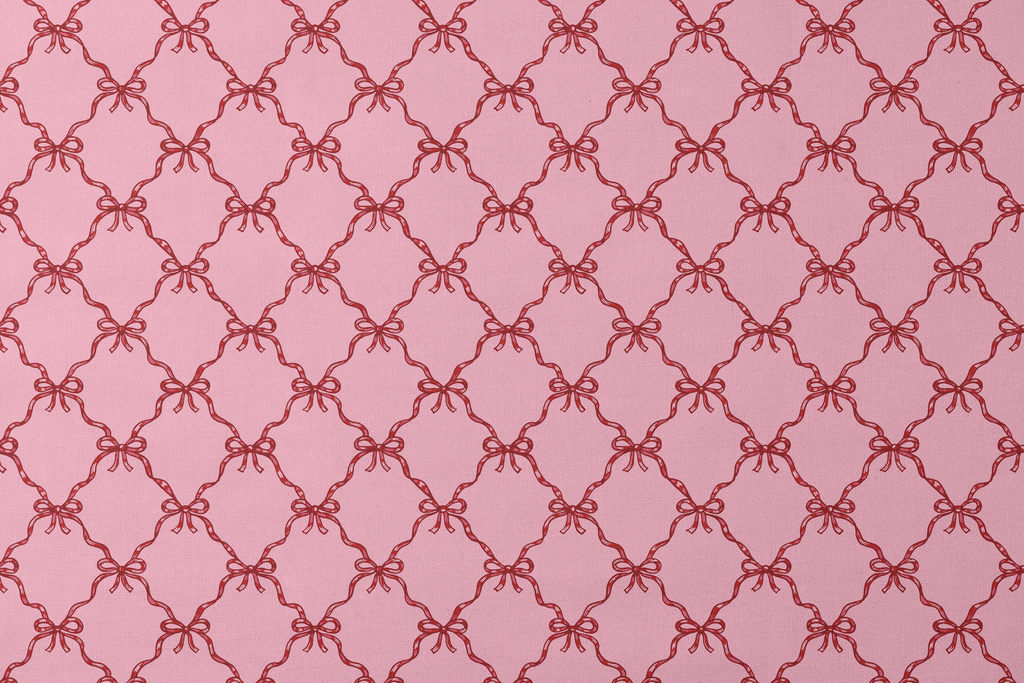 Elegant crimson red ribbon bows create a timeless lattice pattern on a orchid pink background. Perfect for craft, apparel weddings, or sophisticated home decor.
