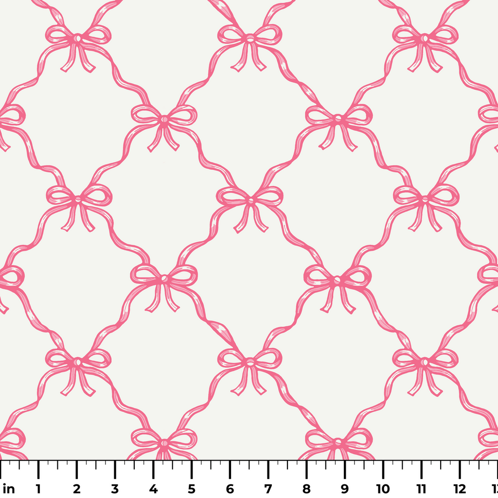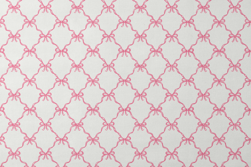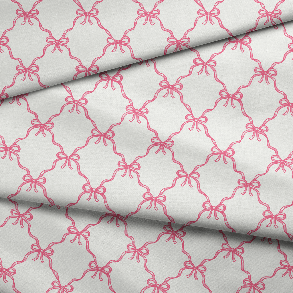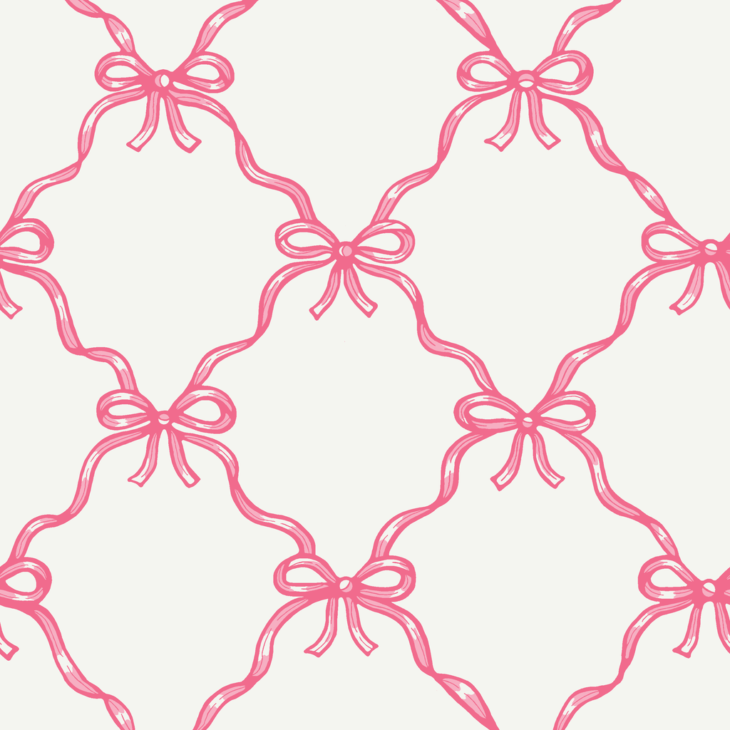 Elegant pink ribbon bows create a timeless lattice pattern on a white background. Perfect for craft, apparel weddings, or sophisticated home decor.