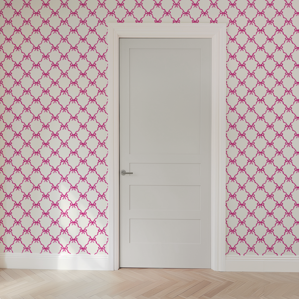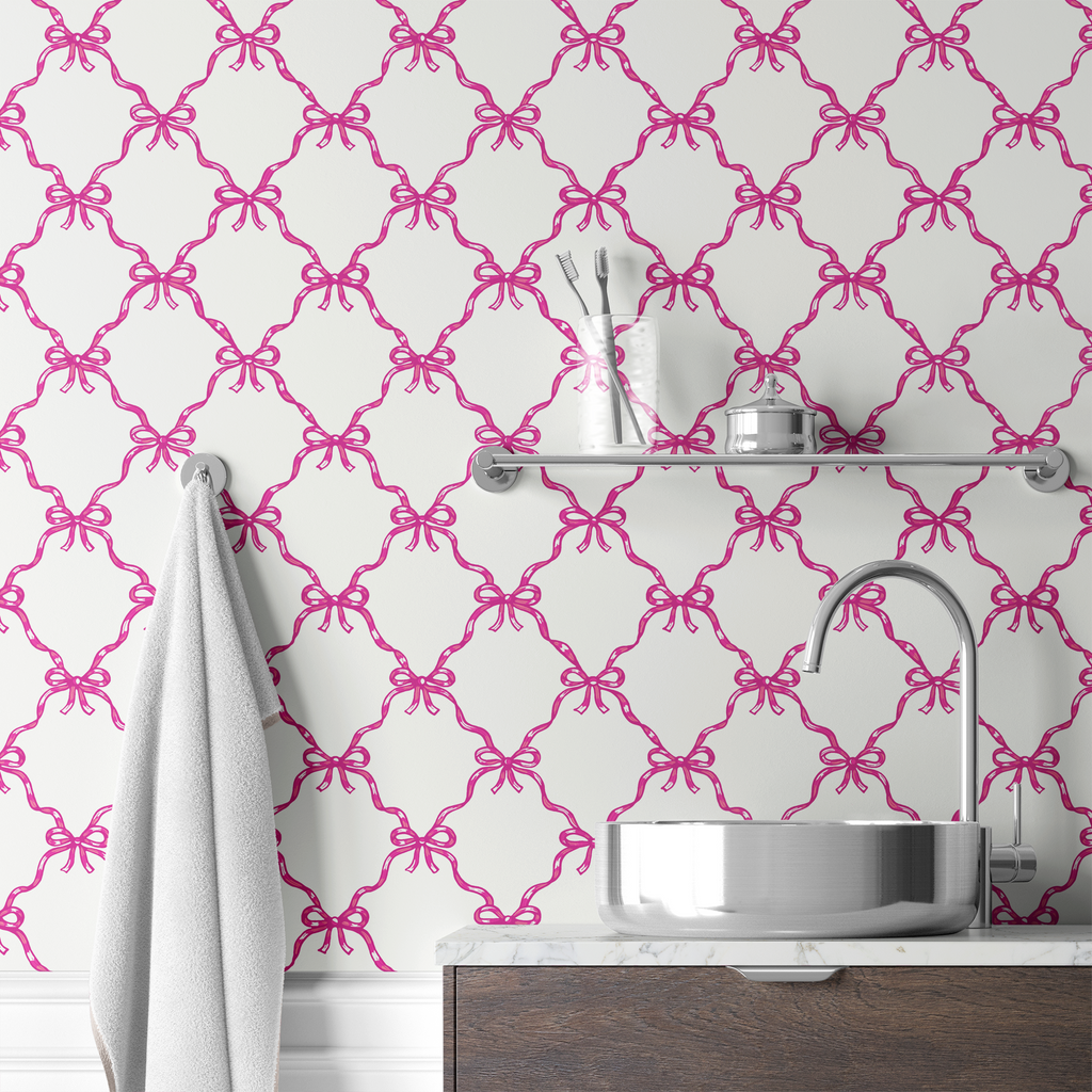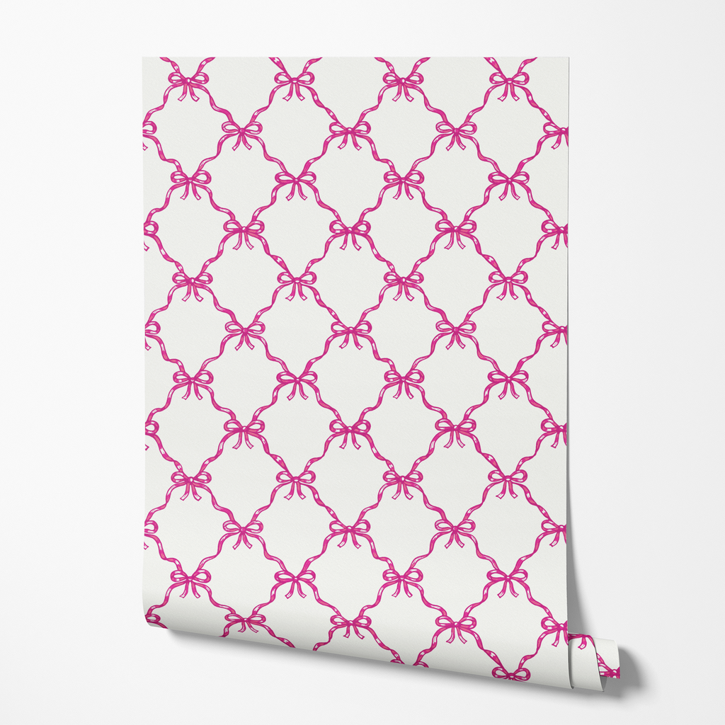 Pink bow ribbon pattern with decorative swirls creating an elegant repeating design perfect for a feminine touch for any space.