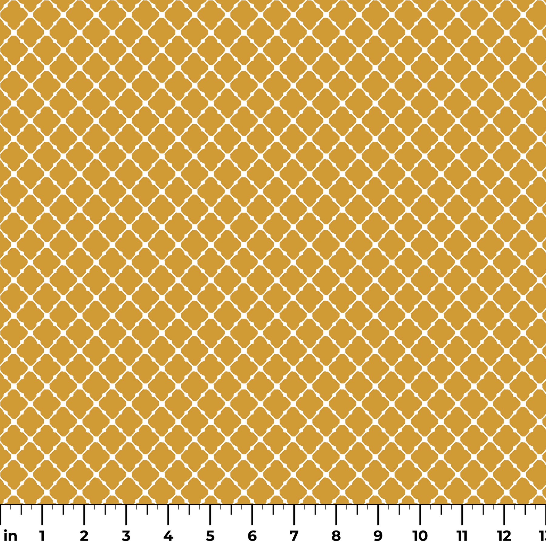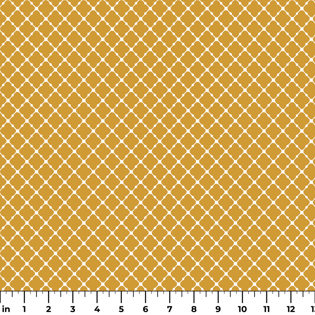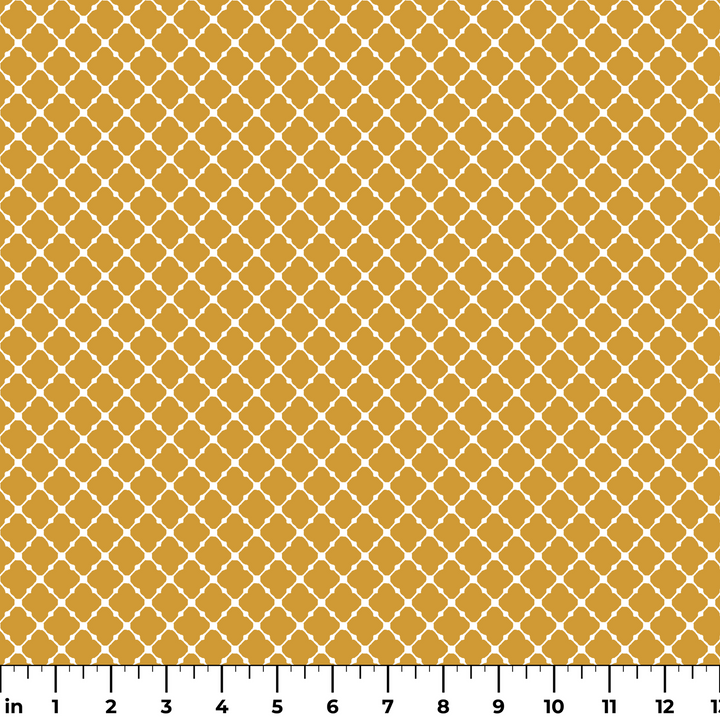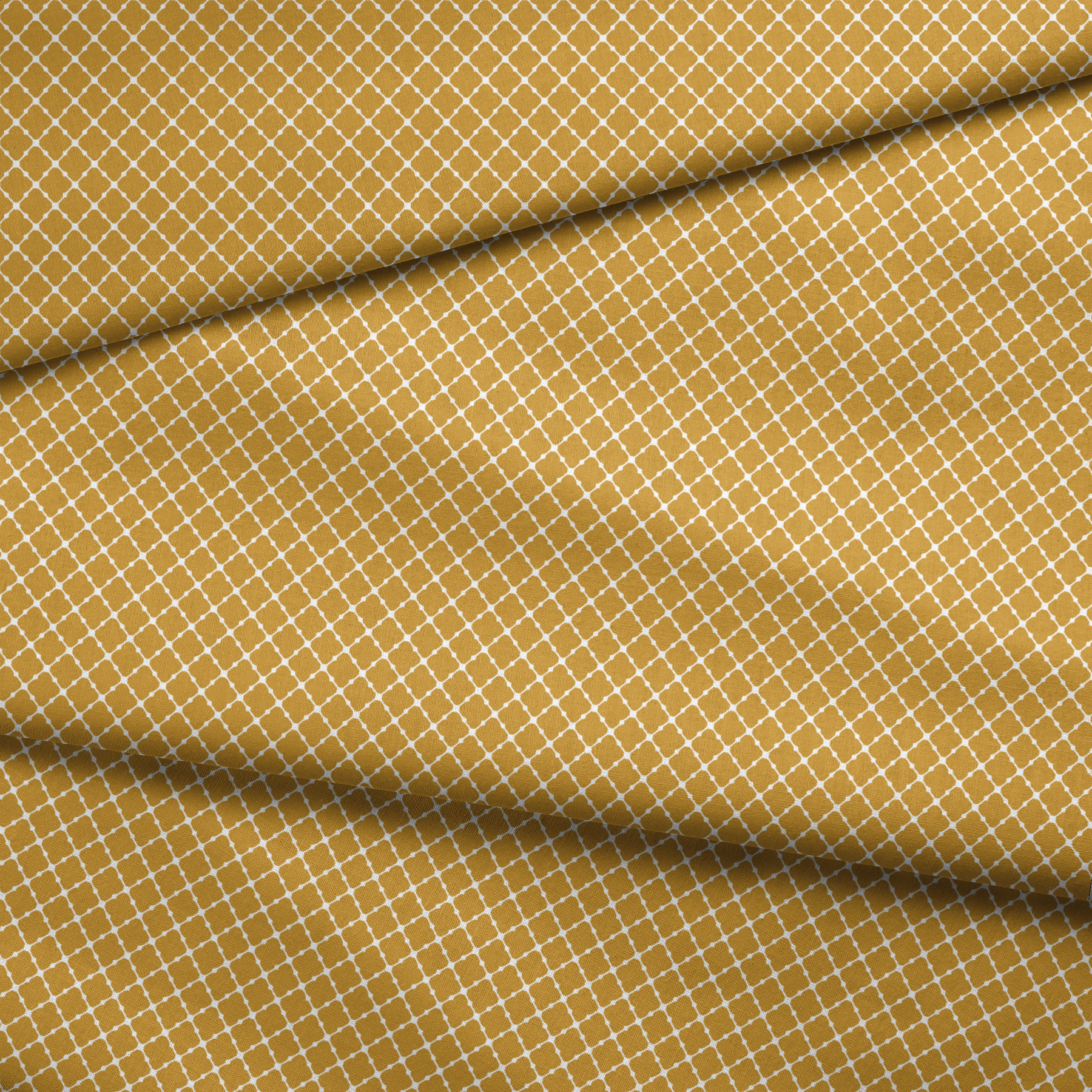 Elegant lattice pattern on a mustard yellow background creates a stylish geometric design. Perfect for sewing contemporary home decor or trendy upholstery projects.
