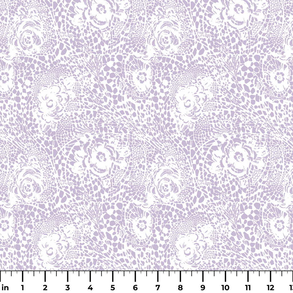 Delicate lavender floral pattern featuring intricate botanical illustrations with roses, leaves and decorative blooms in a vintage cottage garden style perfect for shabby chic decor.