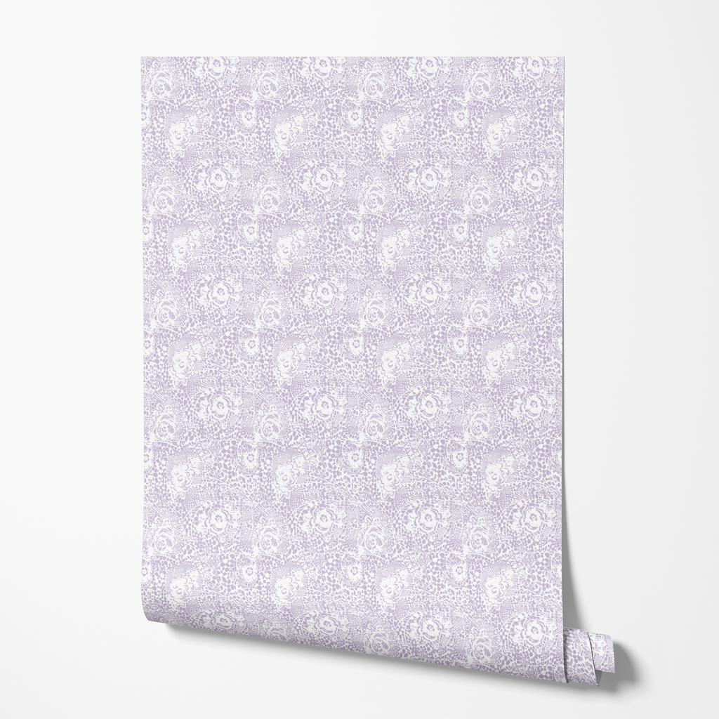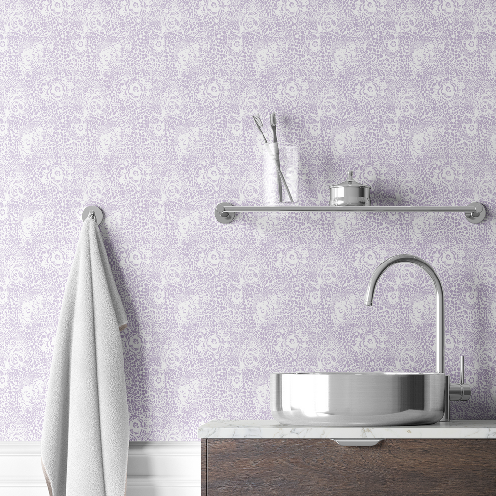 Delicate lavender floral pattern featuring intricate botanical illustrations with roses, leaves and decorative blooms in a vintage cottage garden style perfect for shabby chic decor.