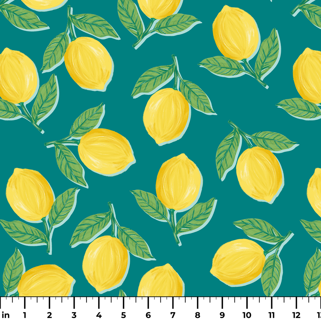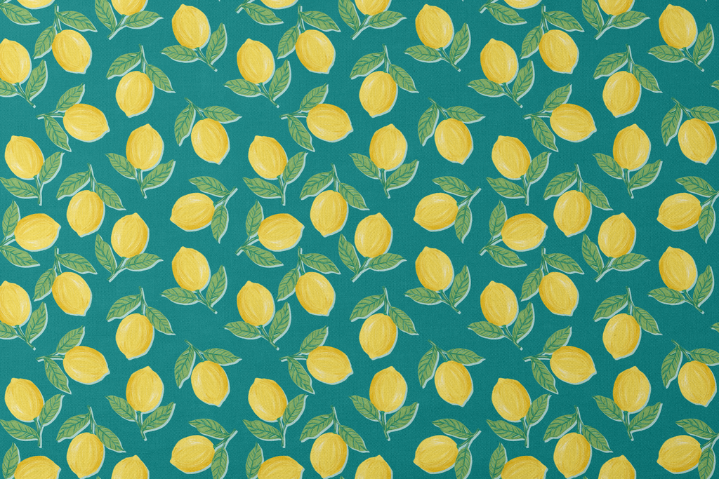 Bring some zest to your next project with these hand-drawn lemons and leafy branches. The rich teal background makes those sunny yellows pop, perfect for a cheerful kitchen look or fruity apparel.