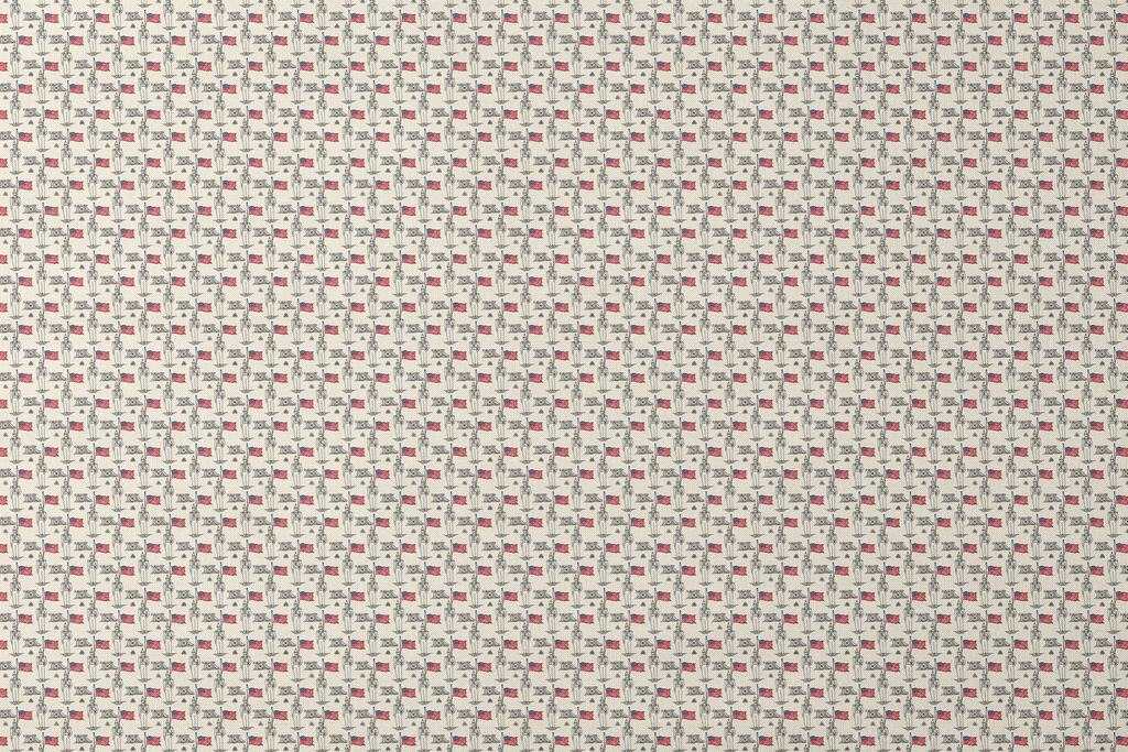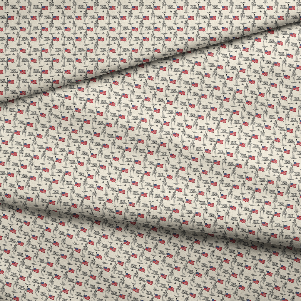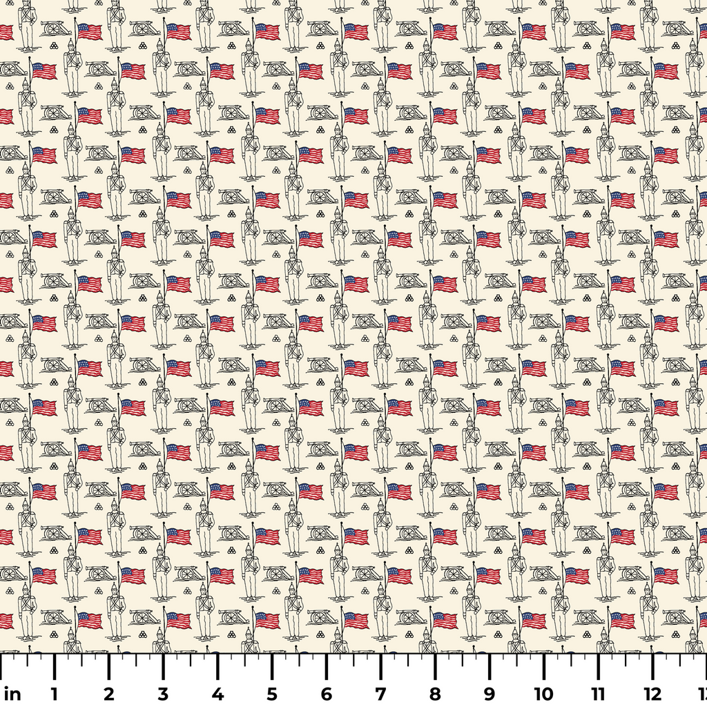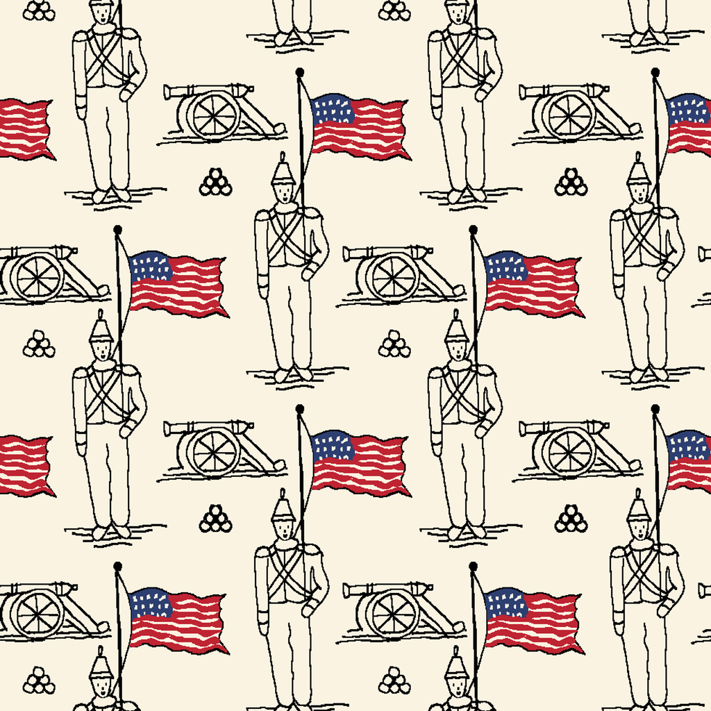 This charming historical design features a cream background adorned with line-drawn revolutionary soldiers, vintage cannons, and bold American flags in traditional red, white, and blue. The nostalgic sketch-style illustrations capture the spirit of early America with stacked cannonballs and uniformed figures standing at attention throughout the pattern. Perfect for patriotic quilting projects or crafting special items for Fourth of July celebrations.