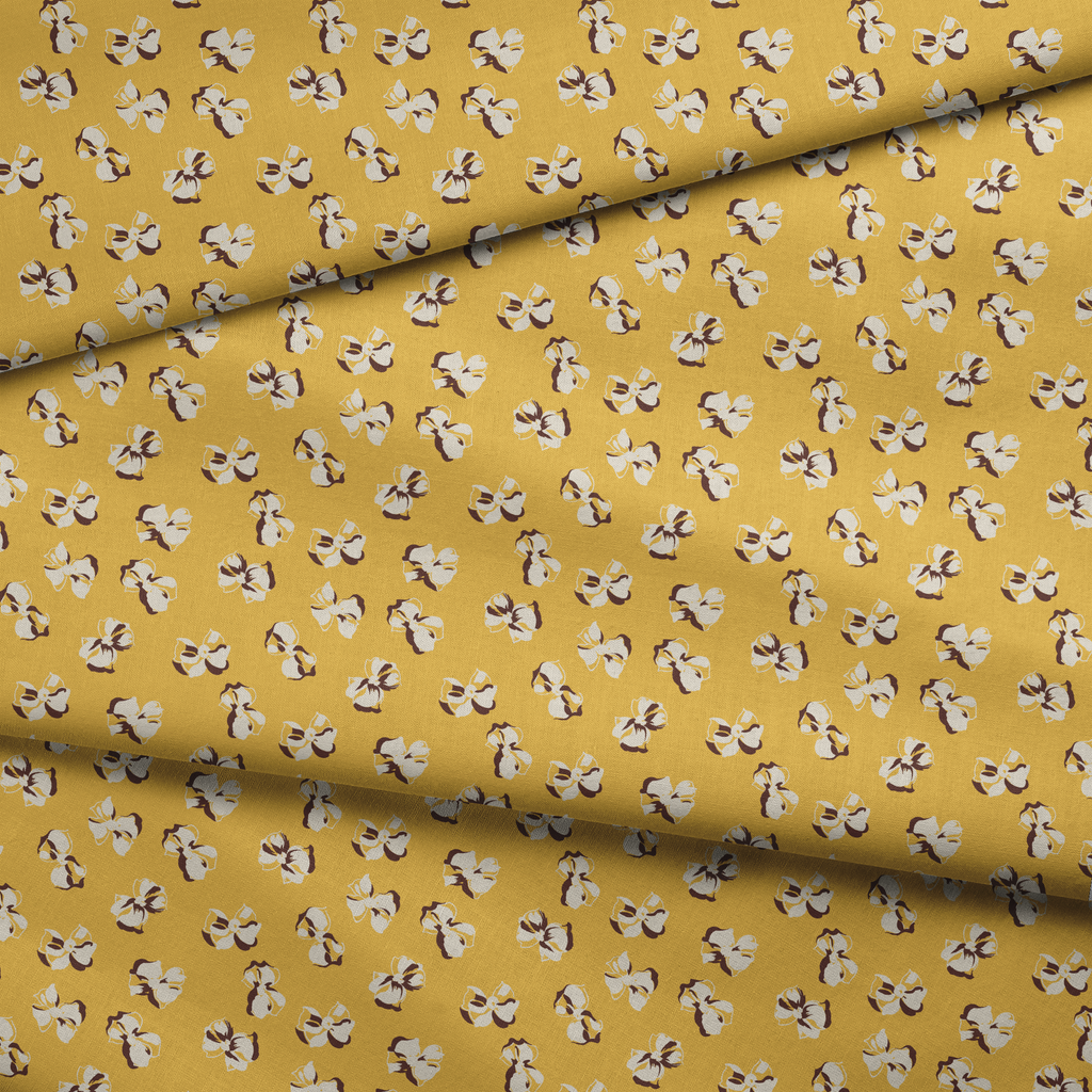 Vintage-inspired bow pattern featuring cream and brown bows on a warm mustard yellow background with retro feminine charm.
