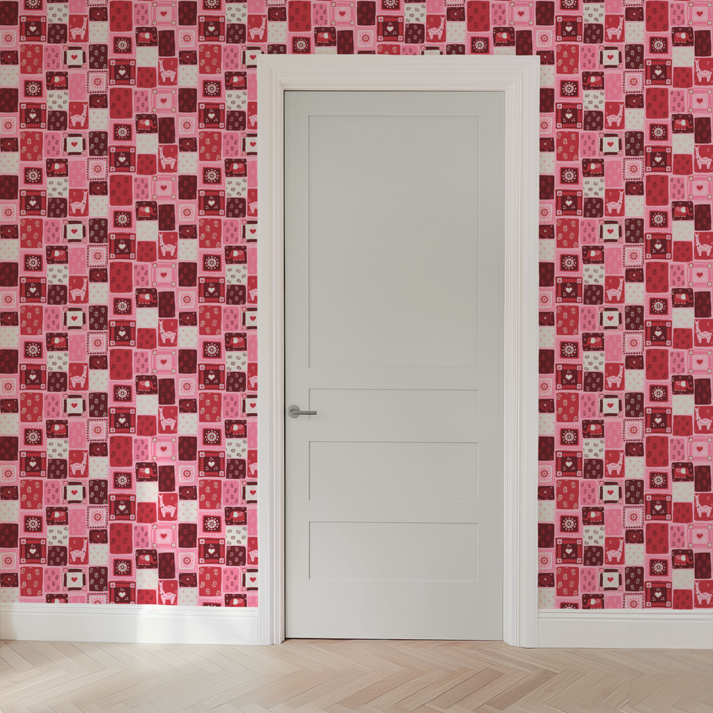 This vibrant patchwork design features retro elephants, floral motifs, and llamas in warm pink, red, and burgundy tones, perfect for adding a cute, festive feel to any space.