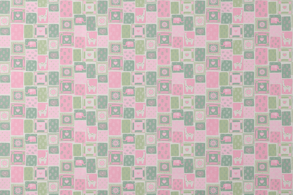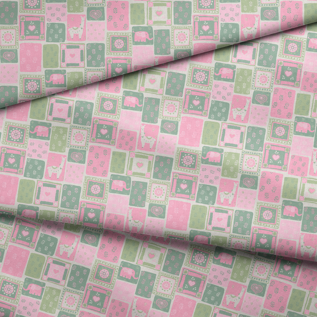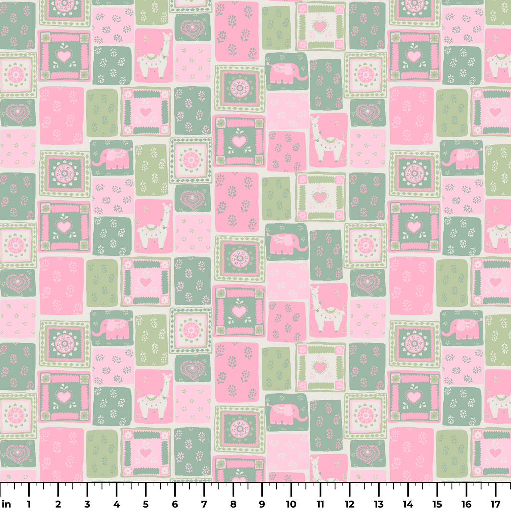 This vibrant patchwork design features retro elephants, floral motifs, and llamas in warm pink, green, and white tones, perfect for quilting projects or bohemian home decor.