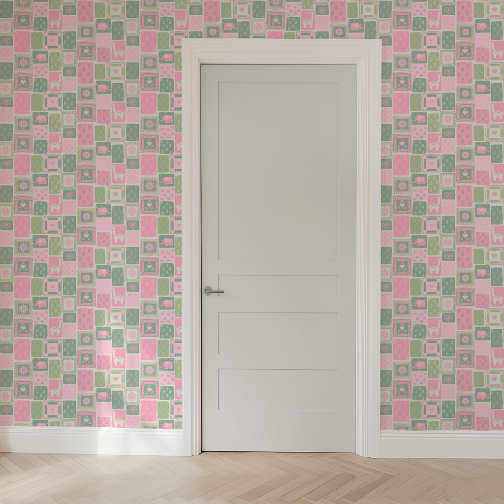 This vibrant patchwork design features retro elephants, floral motifs, and llamas in warm pink, green, and white tones, perfect for adding a cute, festive feel to any space.
