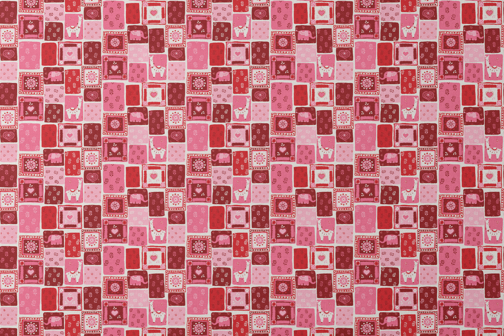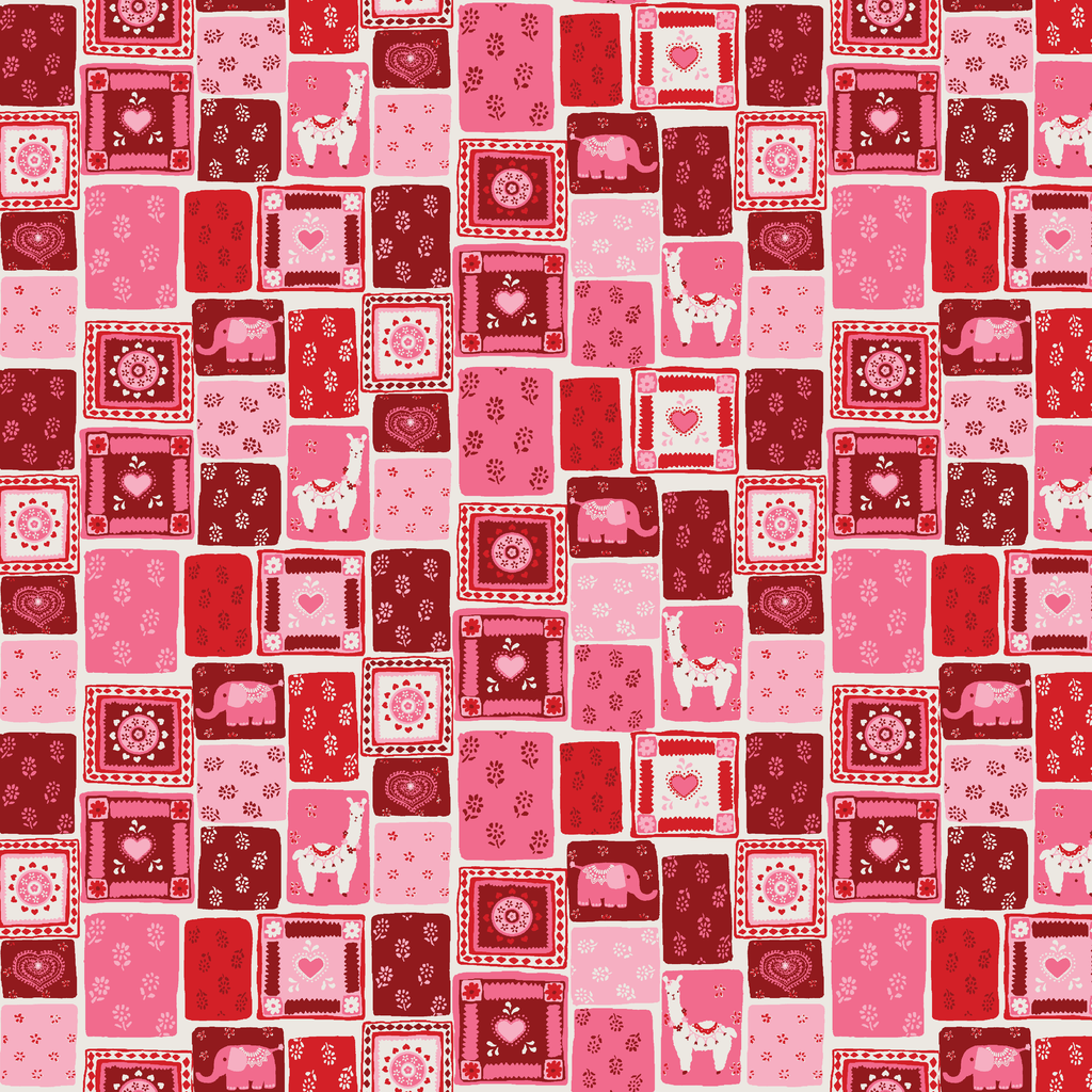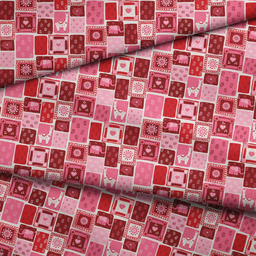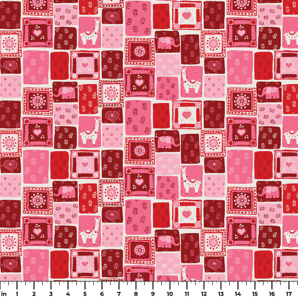 This vibrant patchwork design features retro elephants, floral motifs, and llamas in warm pink, red, and white tones, perfect for quilting projects or bohemian home decor.