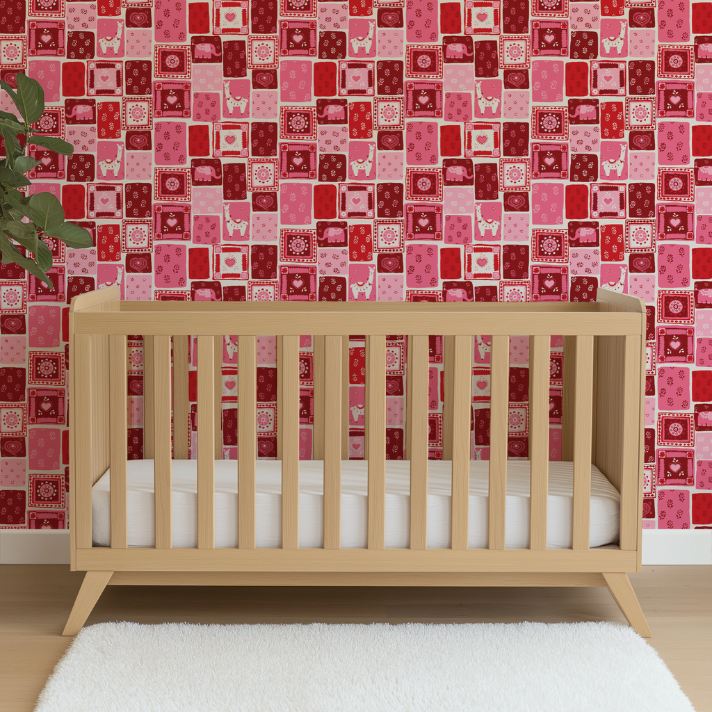 This vibrant patchwork design features retro elephants, floral motifs, and llamas in warm pink, red, and white tones, perfect for adding a cute, festive feel to any space.