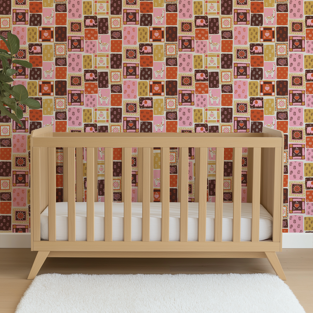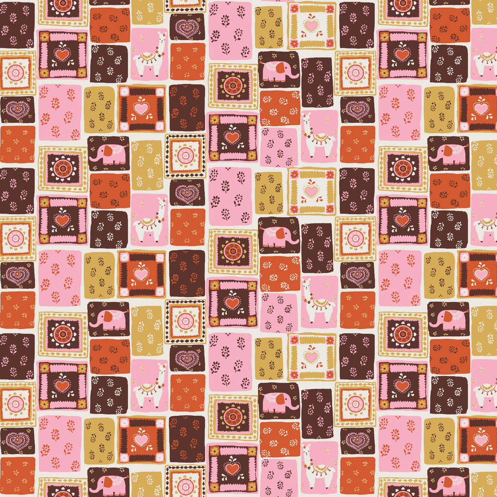 This vibrant patchwork design features retro elephants, floral motifs, and llamas in warm pink, orange, and brown tones, perfect for adding a cute, festive feel to any space.