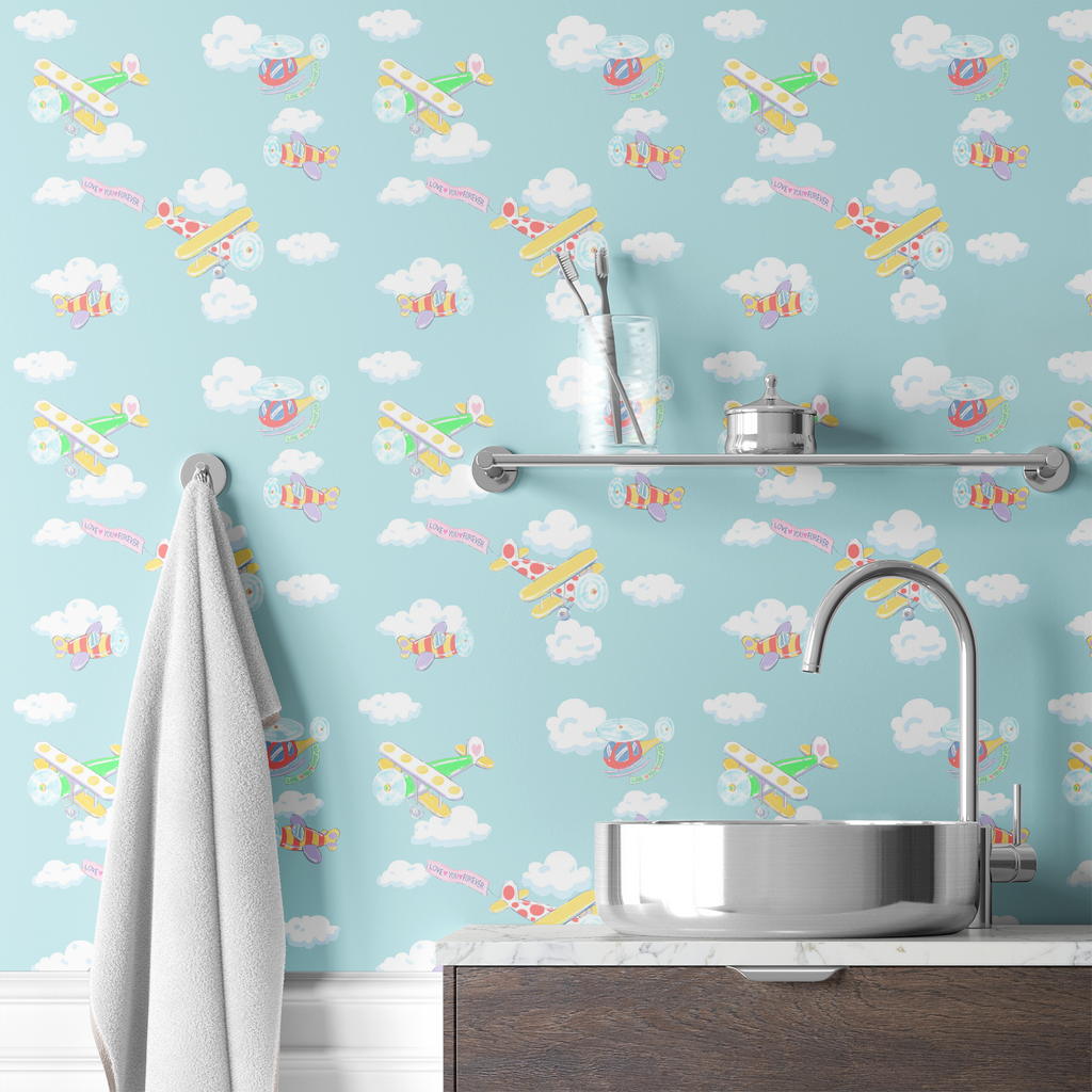 Officially licensed "Love You Forever®" pattern featuring adorable airplanes soaring through a dreamy blue sky with fluffy white clouds. A colorful mix of airplanes create a whimsical aviation-themed perfect for nurseries and a must have for the children's classic, Love You Forever.