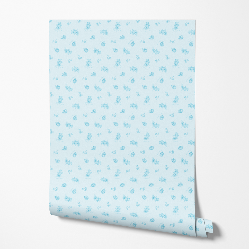 Officially licensed "Love You Forever®" pattern featuring delicate blue bears with "Love You Forever" text on a soft blue background. Perfect for nurseries and for fans of the classic book, Love You Forever.