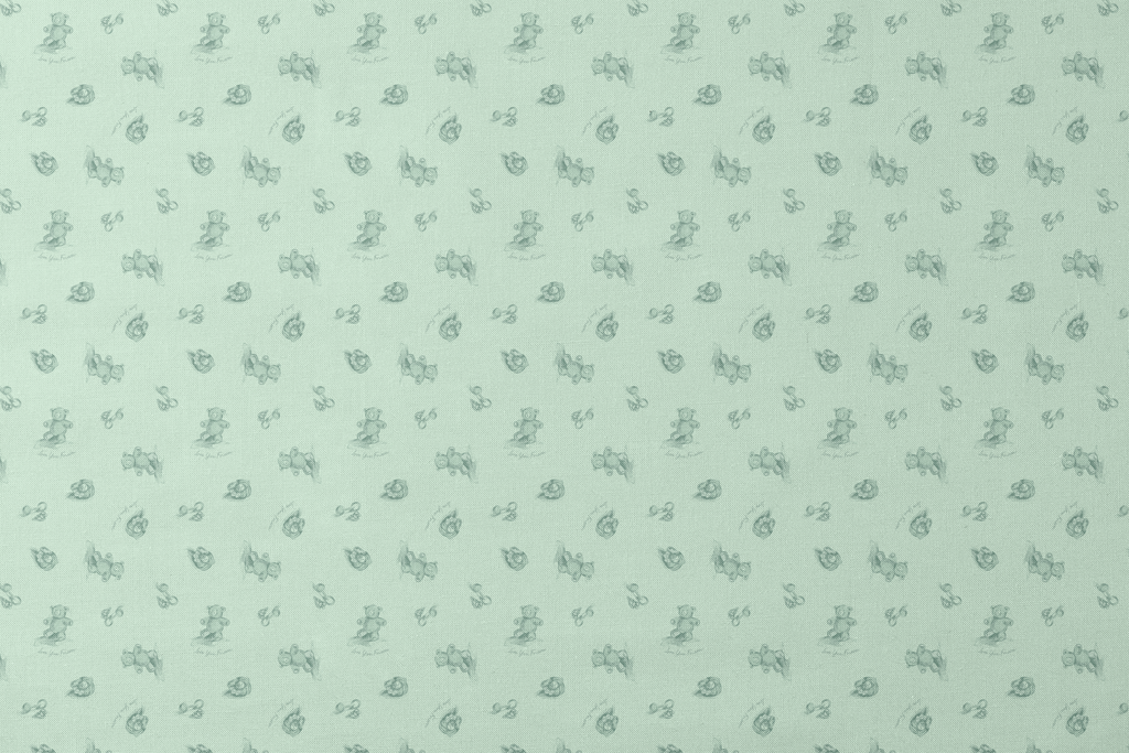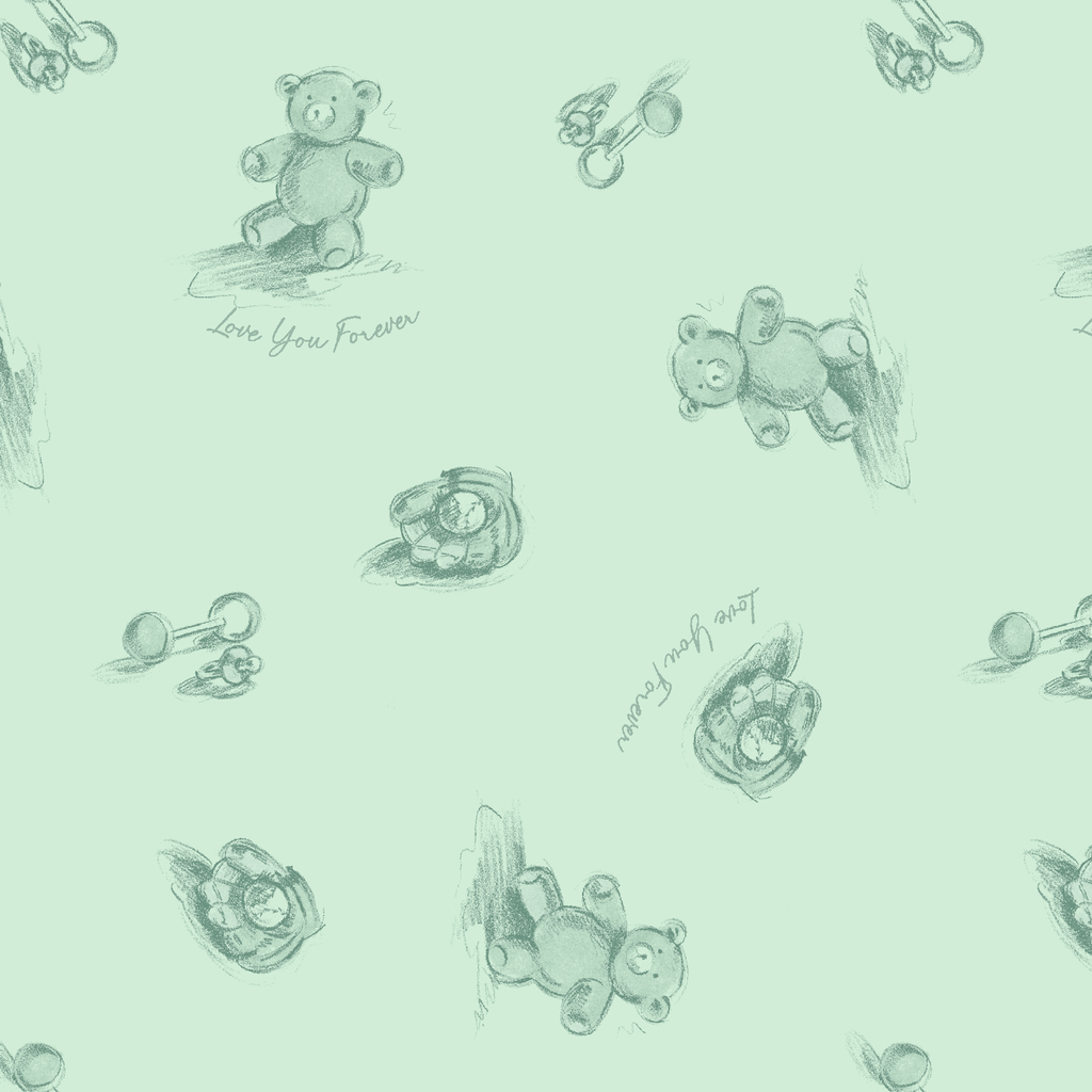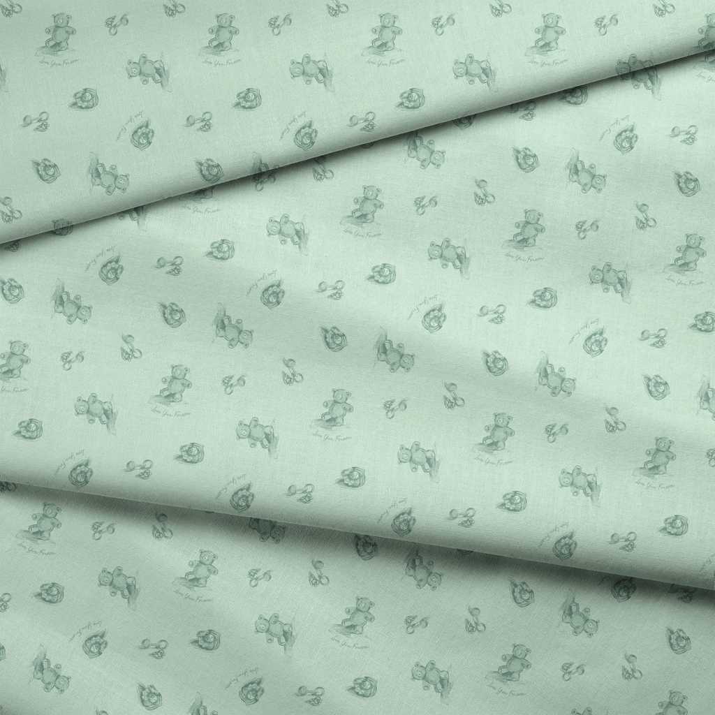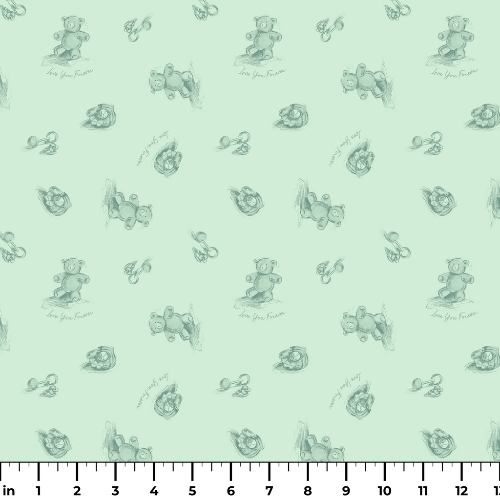 Officially licensed "Love You Forever®" pattern featuring delicate green bears with "Love You Forever" text on a soft green background. Perfect for nursery decor and for fans of the classic book, Love You Forever.