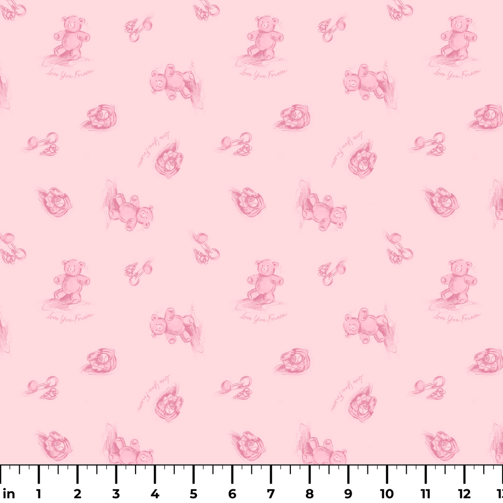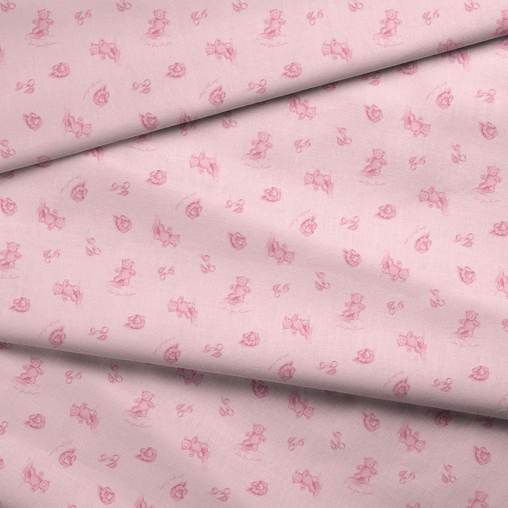 Officially licensed "Love You Forever®" pattern featuring delicate pink bears with "Love You Forever" text on a soft pink background. Perfect for nursery decor and for fans of the classic book, Love You Forever.