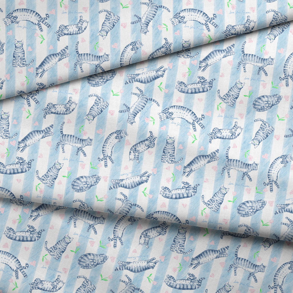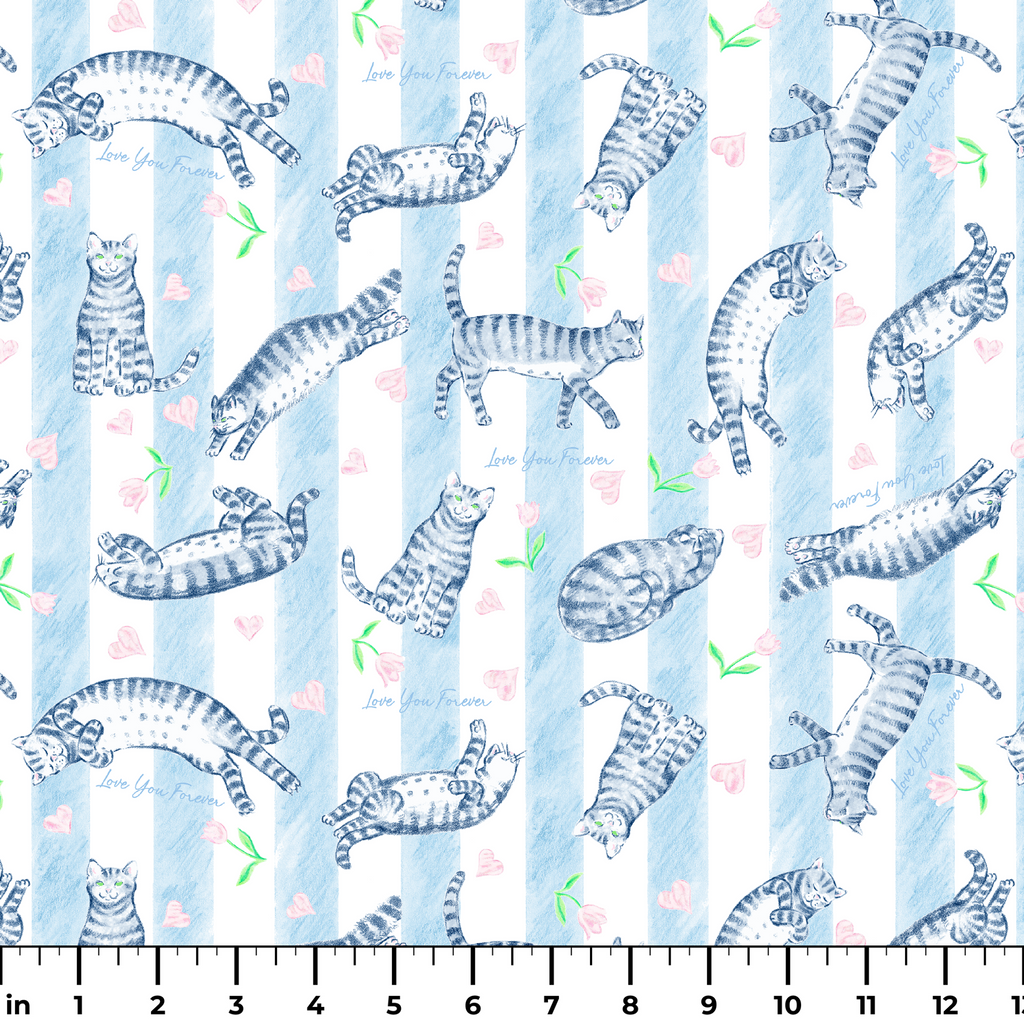 Love You Forever® Cats and Tulips on Blue Stripes Fabric