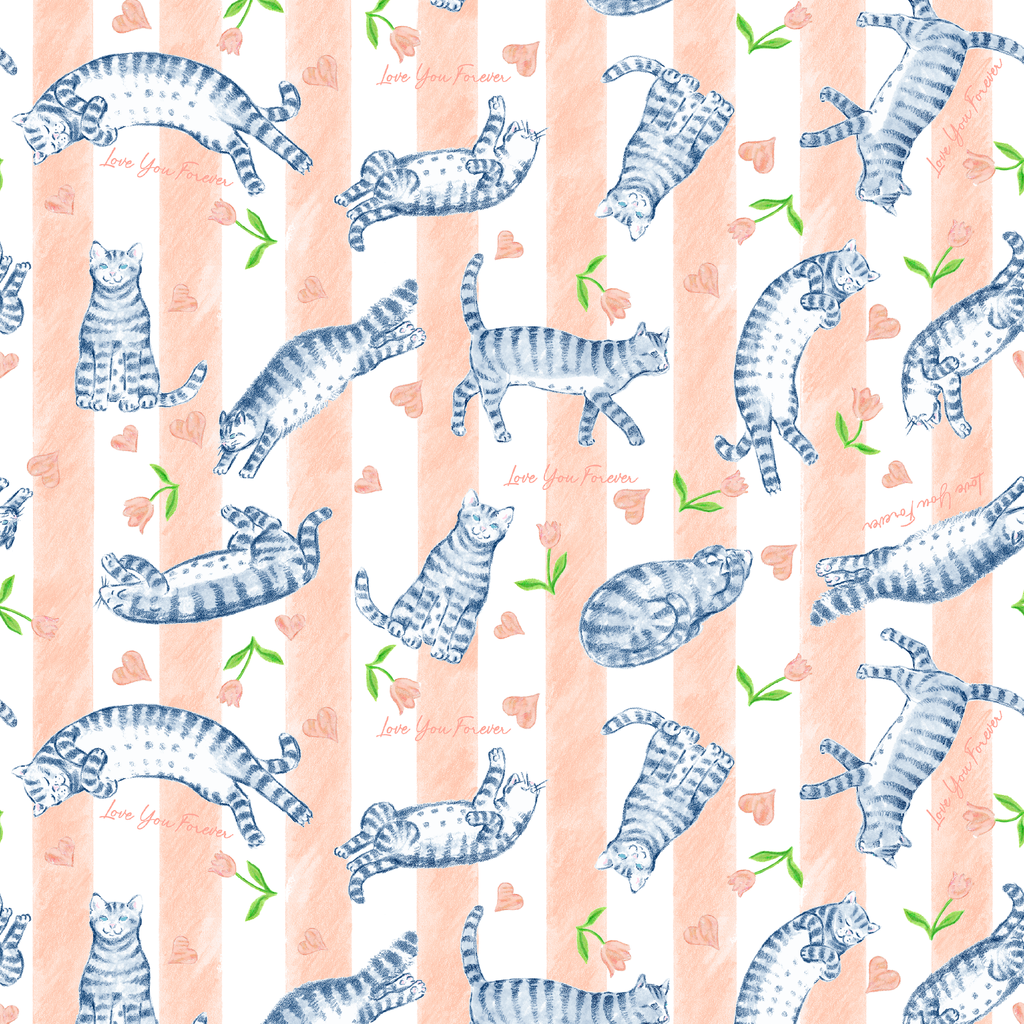 Officially licensed "Love You Forever®" pattern featuring adorable blue striped cats in various stretching poses against a soft peach striped background with tulips and small pink hearts. Perfect for nurseries and for fans of the classic book, Love You Forever.