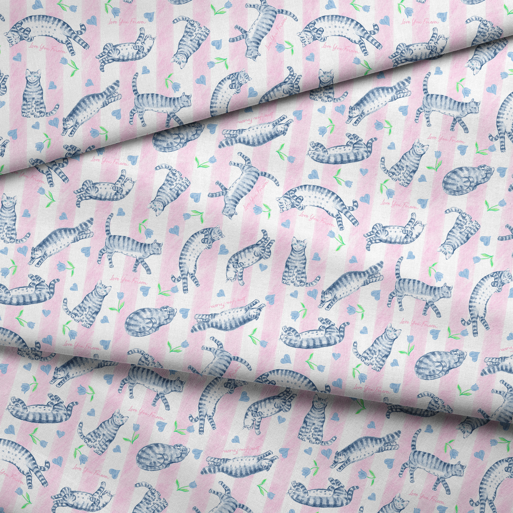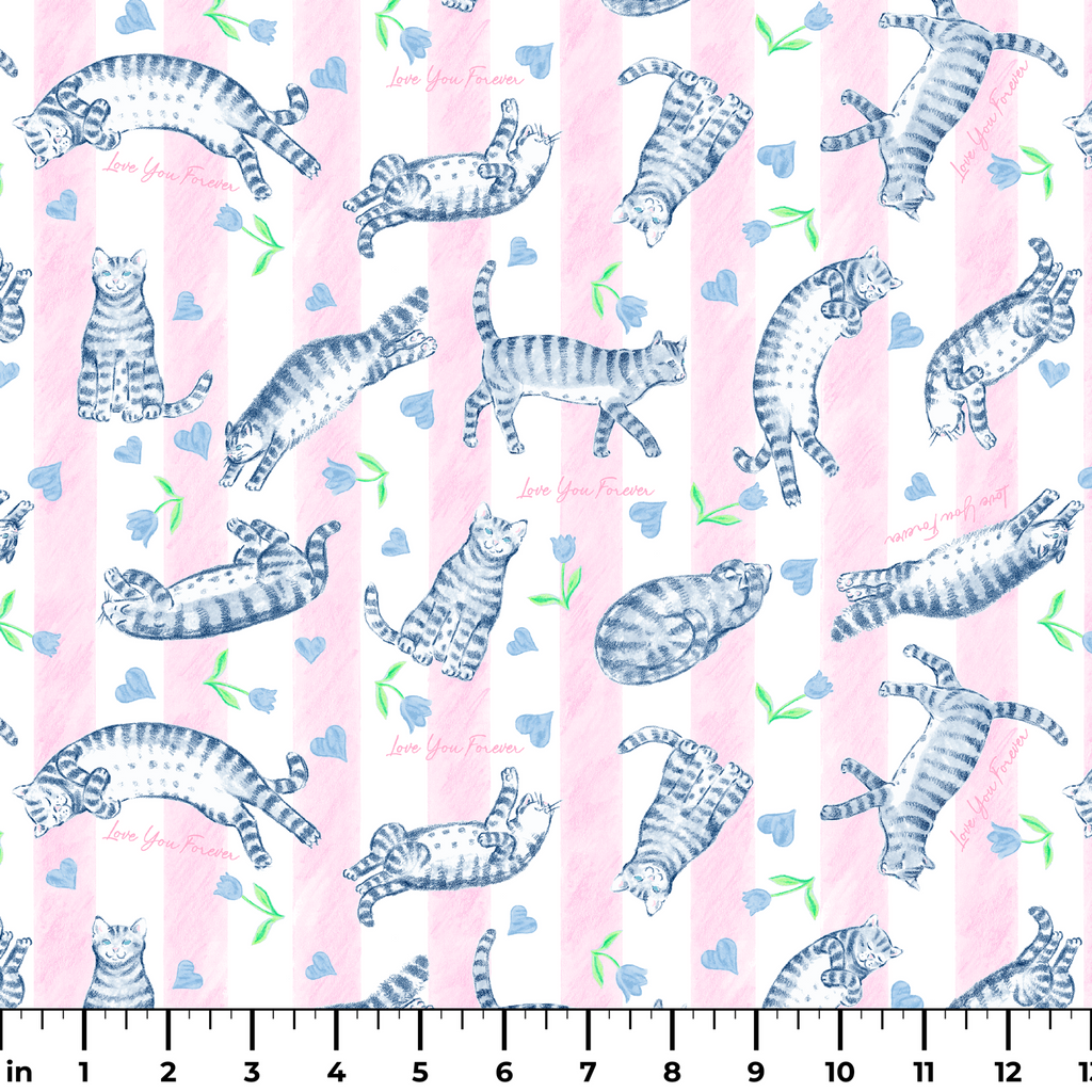 Officially licensed "Love You Forever®" pattern featuring adorable blue striped cats in various stretching poses against a soft pink striped background with tulips and small pink hearts. Perfect for nursery decor and for fans of the classic book, Love You Forever.