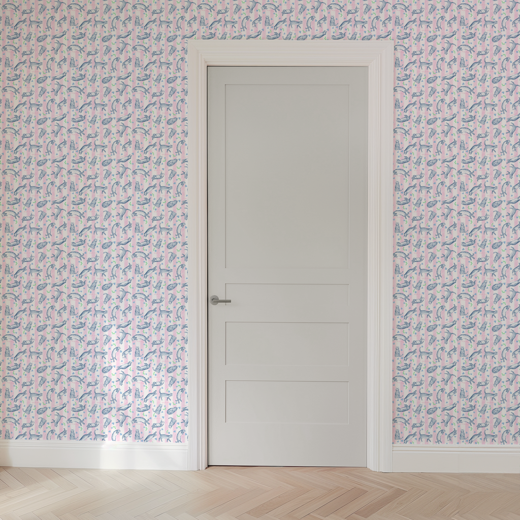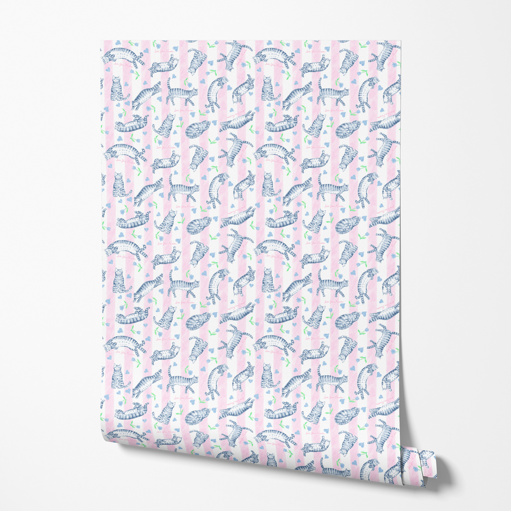 Love You Forever® Cats and Tulips on Pink Stripes Wallpaper