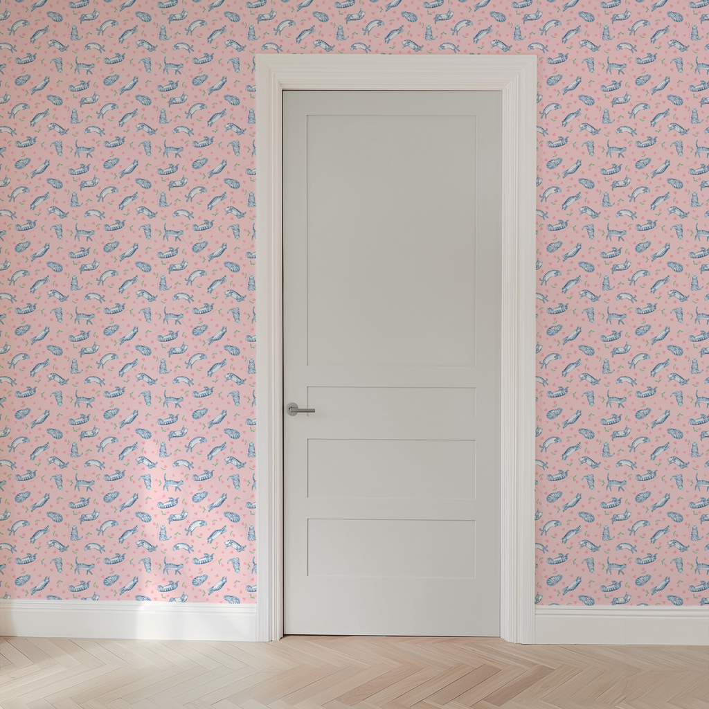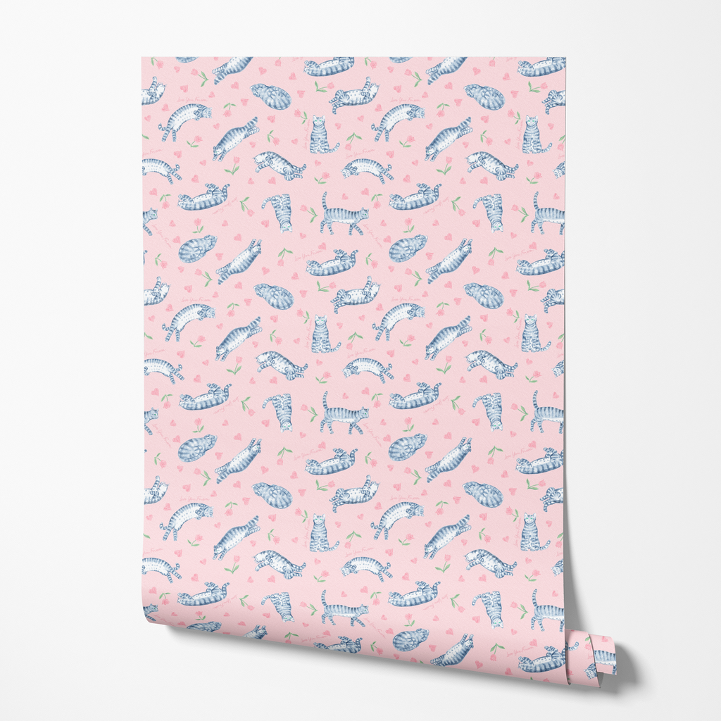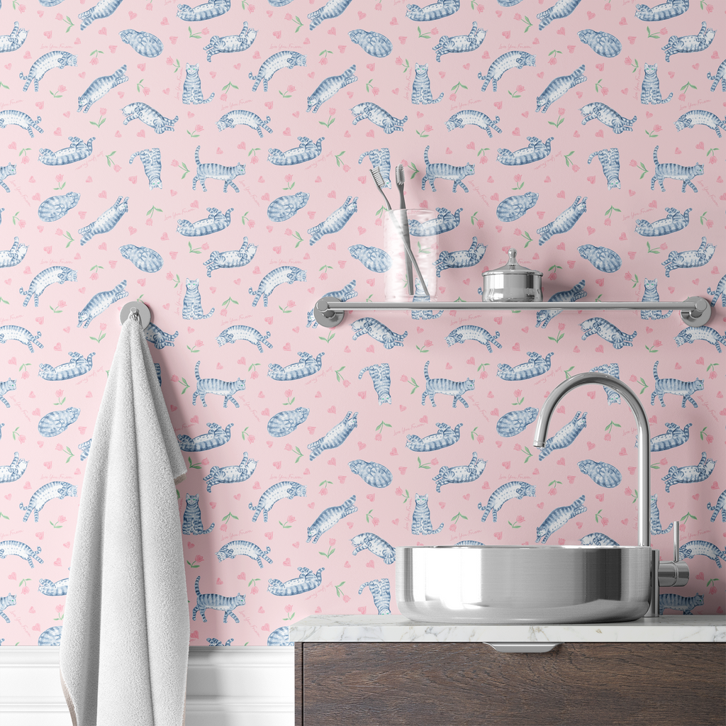 Love You Forever® Cats and Tulips on Pink Wallpaper