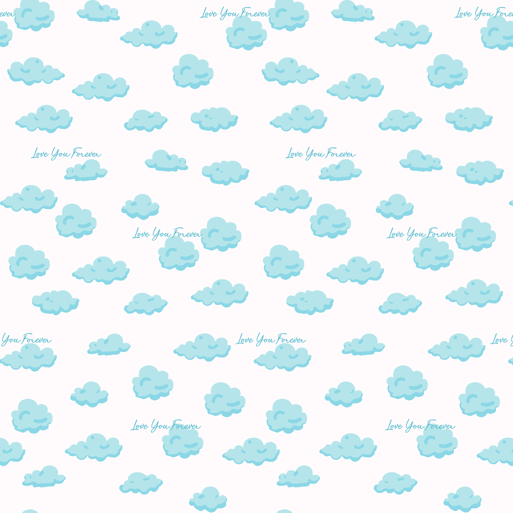 Officially licensed "Love You Forever®" pattern featuring dreamy blue clouds floating across a soft white background. Perfect for nurseries and for fans of the classic book, Love You Forever.