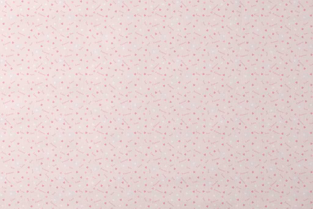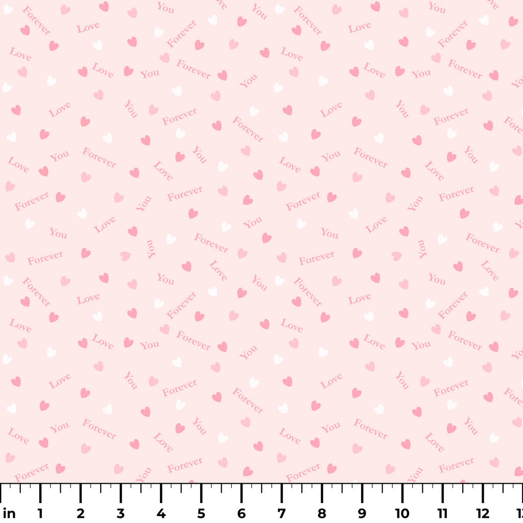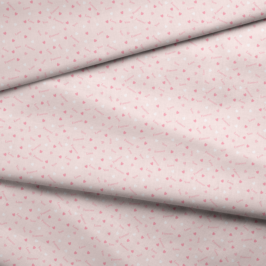 Officially licensed "Love You Forever®" pattern featuring delicate hearts scattered across a soft pink background with text featuring "Love," "You," and "Forever." Perfect for nursery decor and for fans of the classic book, Love You Forever.