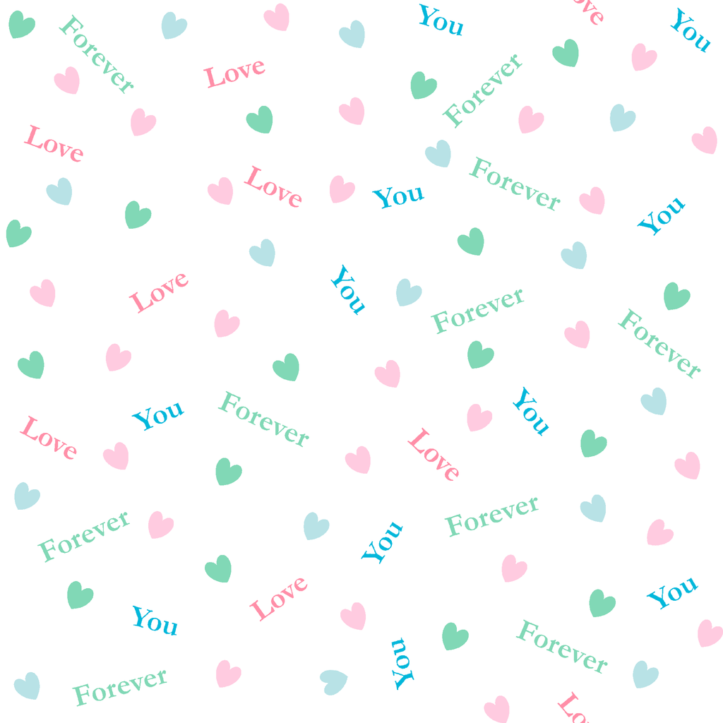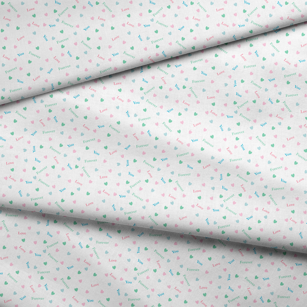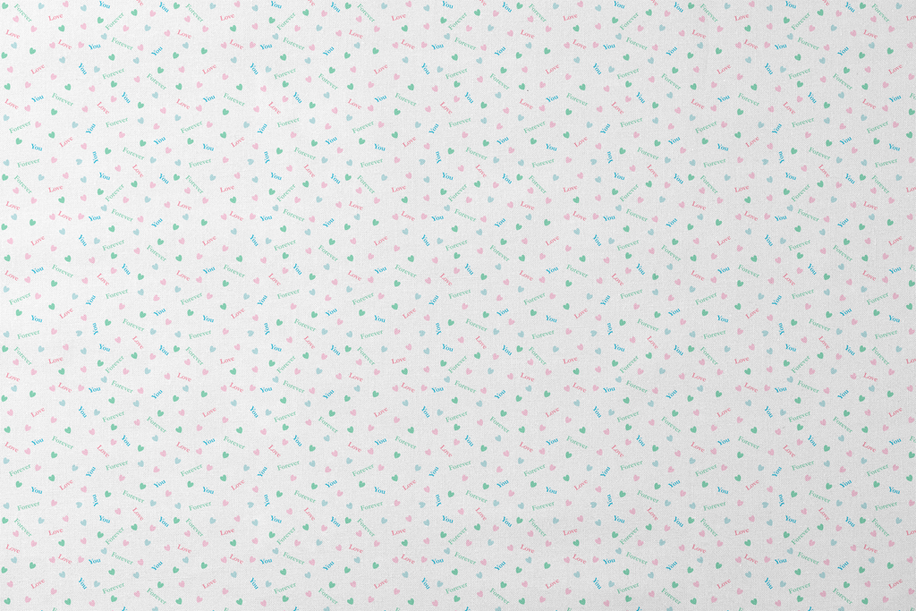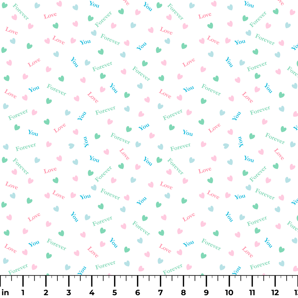Officially licensed "Love You Forever®" pattern featuring delicate hearts scattered across a soft white background with text featuring "Love," "You," and "Forever." Perfect for nursery decor and for fans of the classic book, Love You Forever.