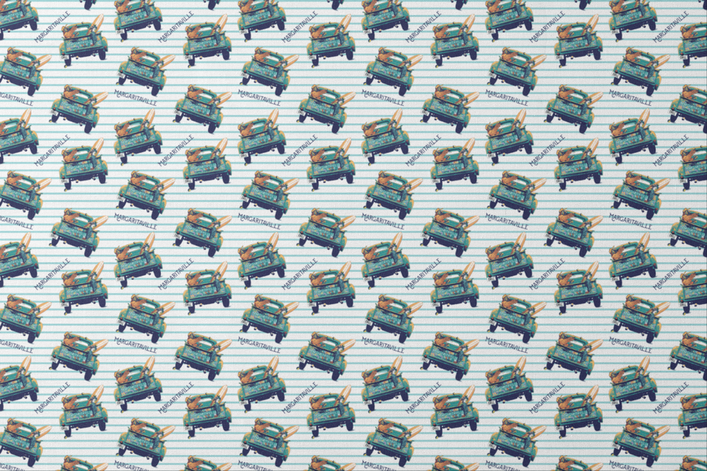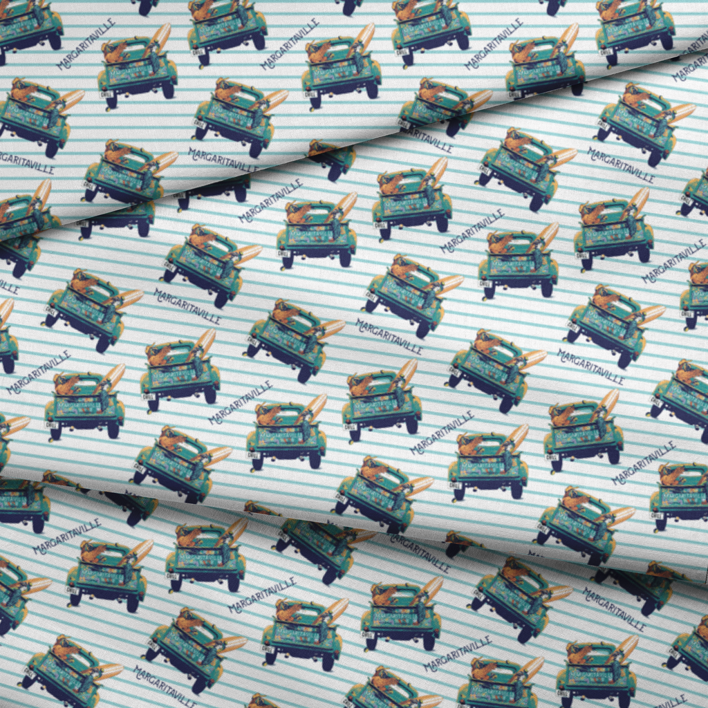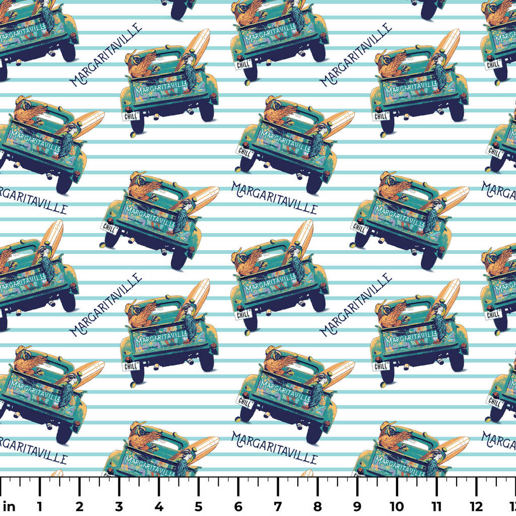 Cruise into vacation mode with this playful Margaritaville fabric featuring vintage-style mint green pickup trucks loaded with surfboards and tropical birds against a breezy blue and white striped background. Each truck sports a "CHILL" license plate and the iconic Margaritaville branding, perfectly capturing that laid-back coastal vibe. This whimsical print would make fantastic beach totes, poolside pillows, or a statement-making cabana curtain for your backyard oasis.