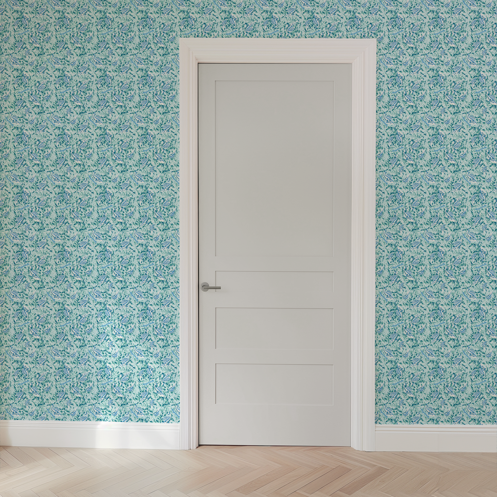 Swirling aquatic Margaritaville pattern in cool blues and greens with flowing organic shapes creates a tranquil underwater effect perfect for any space.