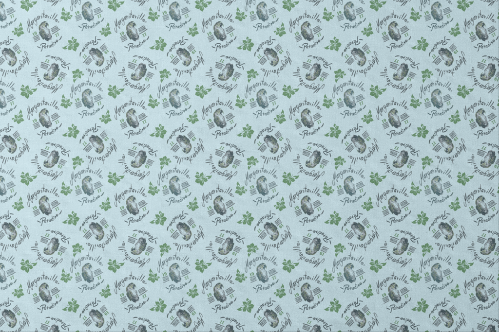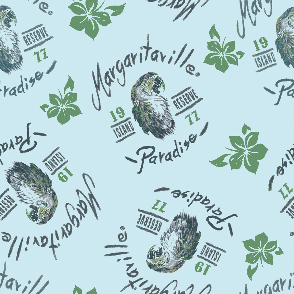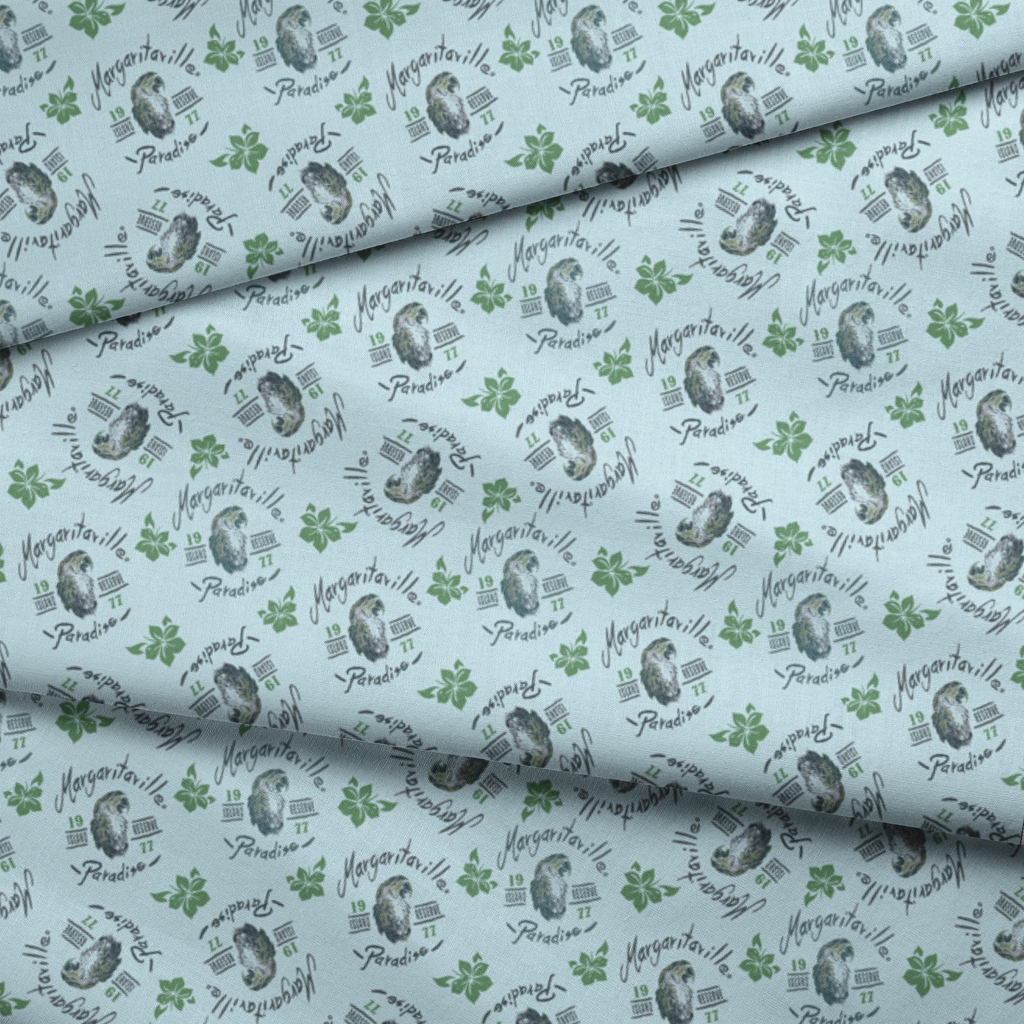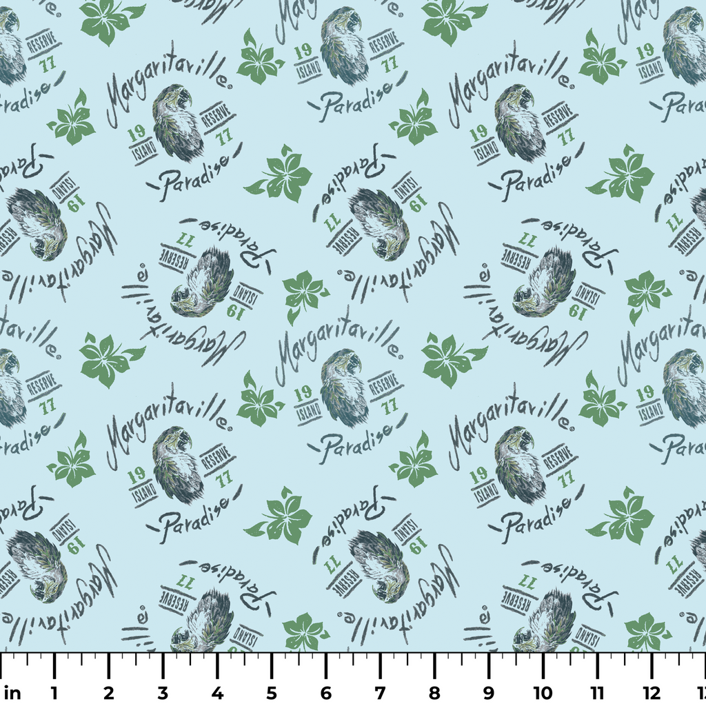Escape to island life with this whimsical Margaritaville pattern featuring illustrated parrots, tropical hibiscus flowers in olive green, and paradise-themed text against a serene mint background. The playful design incorporates elements like "Reserve 77," "Island 19," and "Paradise" that capture the laid-back coastal vibe. This fabric would be perfect for creating beach totes, casual throw pillows, or tropical-themed home décor that brings a touch of vacation spirit to any space.