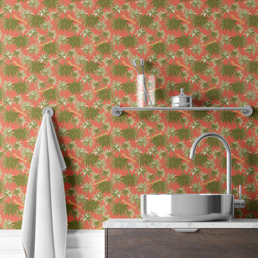Tropical Margaritaville palm trees pattern in vintage style, featuring lush green foliage against a coral background with elegant "Margaritaville" text for a retro resort-inspired look.