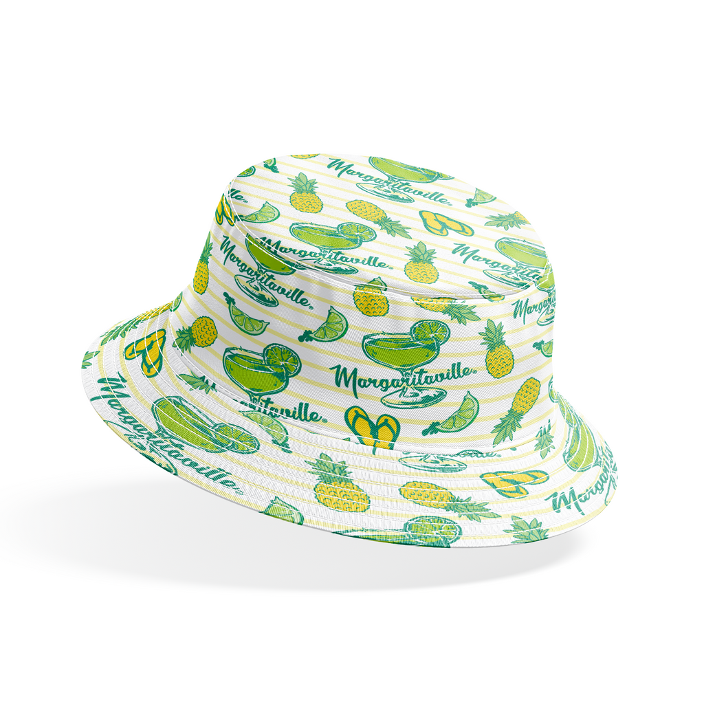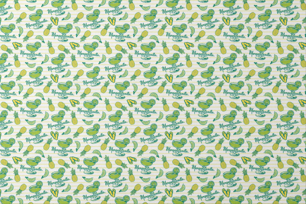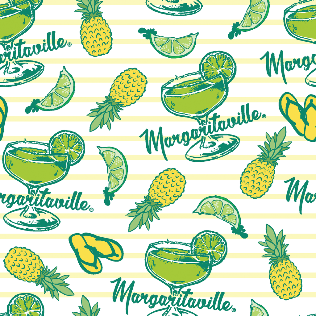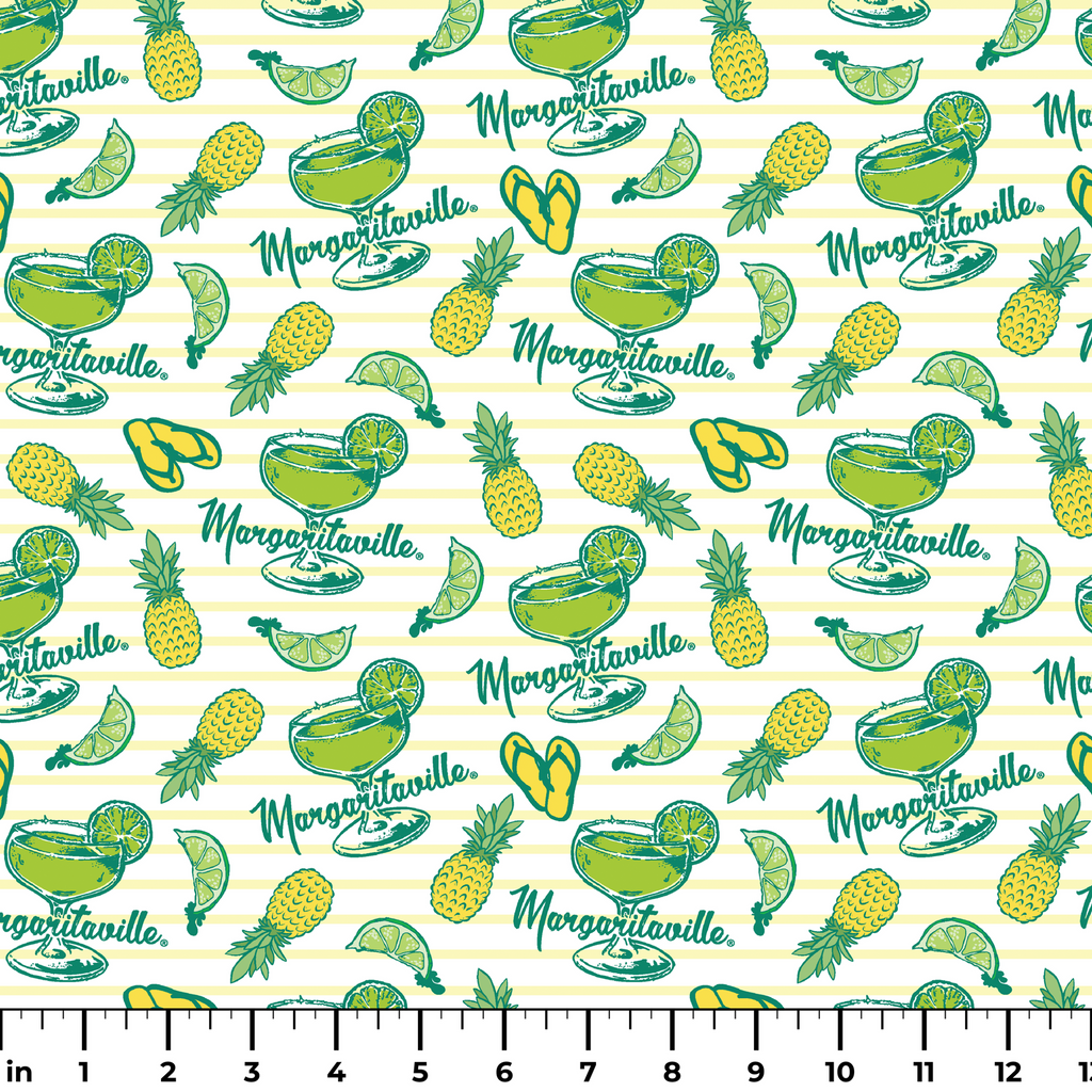 Escape to paradise with this cheerful Margaritaville-themed fabric featuring bright yellow pineapples, lime slices, flip-flops, and margarita glasses scattered across a soft yellow and white striped background. The vibrant greens and sunny yellows create a tropical vacation vibe that practically sings summer. Perfect for creating beach totes, outdoor pillows, or fun kitchen accessories that bring that laid-back island feeling to your everyday life.