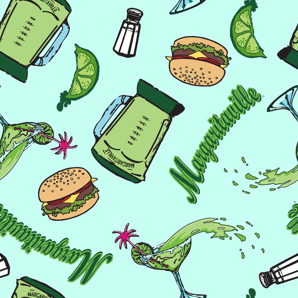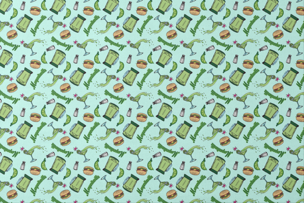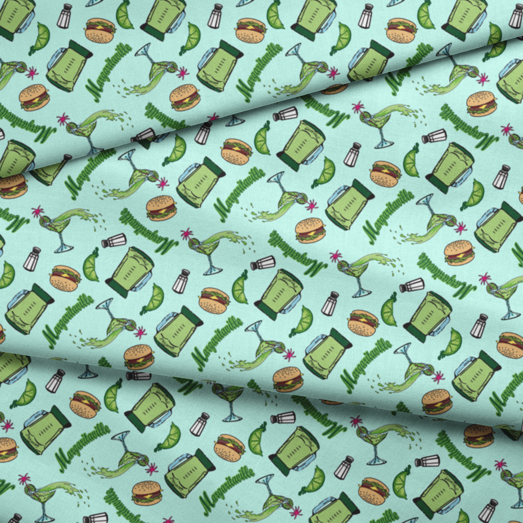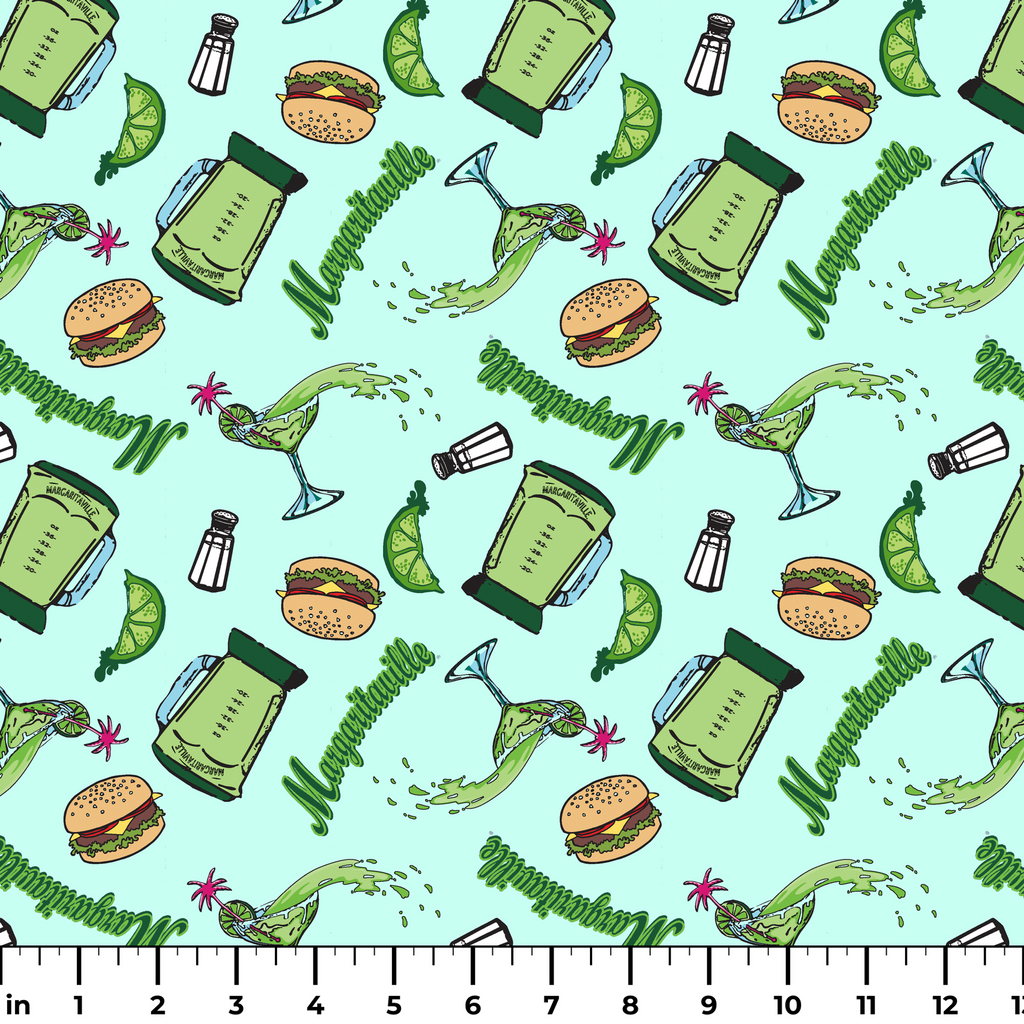 Dive into fiesta flavor with this zesty Margaritaville fabric featuring hand-drawn lime wedges, salt shakers, juicy hamburgers, and splashing cocktails on a refreshing mint background. The whimsical illustrations capture the carefree spirit of a backyard barbecue or beachside celebration, with vibrant greens and pops of pink accents. Perfect for creating summery kitchen accessories like aprons and placemats or crafting festive tote bags that bring vacation vibes to everyday life.