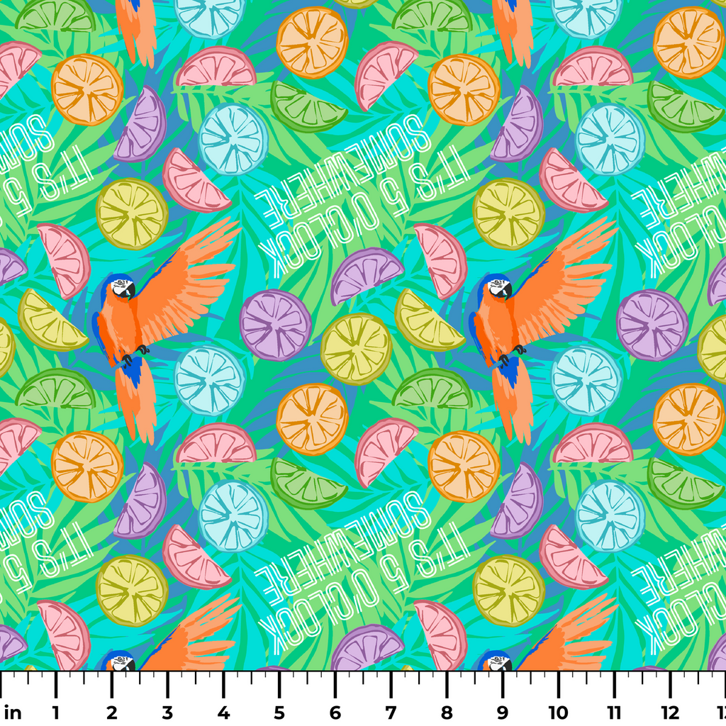 Escape to a tropical paradise with this vibrant Margaritaville fabric featuring colorful citrus slices and a striking orange macaw against a backdrop of lush palm fronds on various shades of turquoise and green background. Playful pastel citrus wedges in pink, purple, yellow, and blue float across the design, creating a festive, vacation-ready vibe. This eye-catching print would be perfect for beach totes, tropical-themed pillows, or summer apparel that brings the island spirit to your everyday creations.