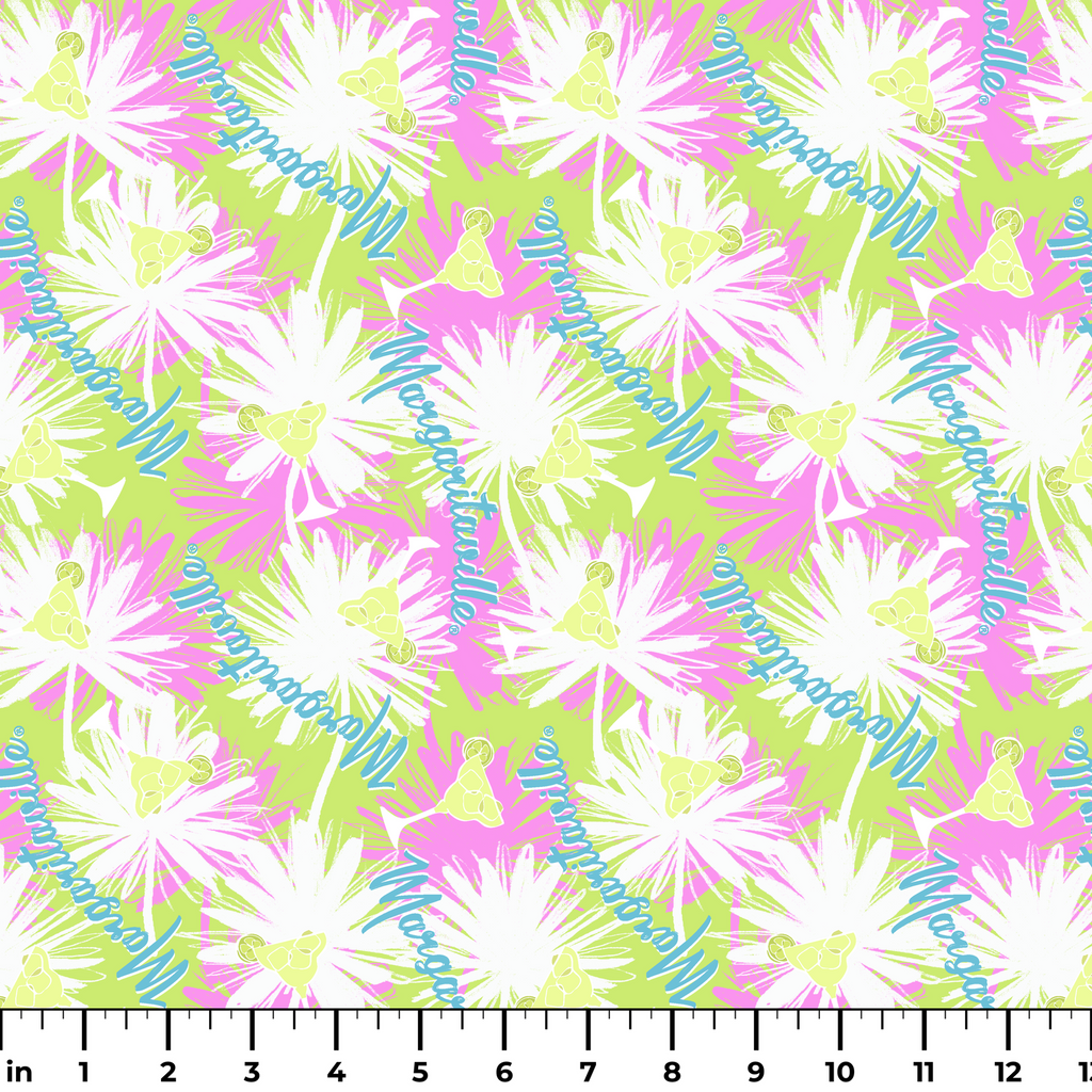 Bursting with tropical energy, this vibrant fabric features splash-like white flowers against a backdrop of electric lime green and orchid purple. Playful cocktail glasses with citrus slices and swirling blue "Margaritaville" text create a fun, carefree pattern that practically sings of summer days. Perfect for creating beach totes, poolside cushions, or festive table runners that bring instant vacation vibes to any space.