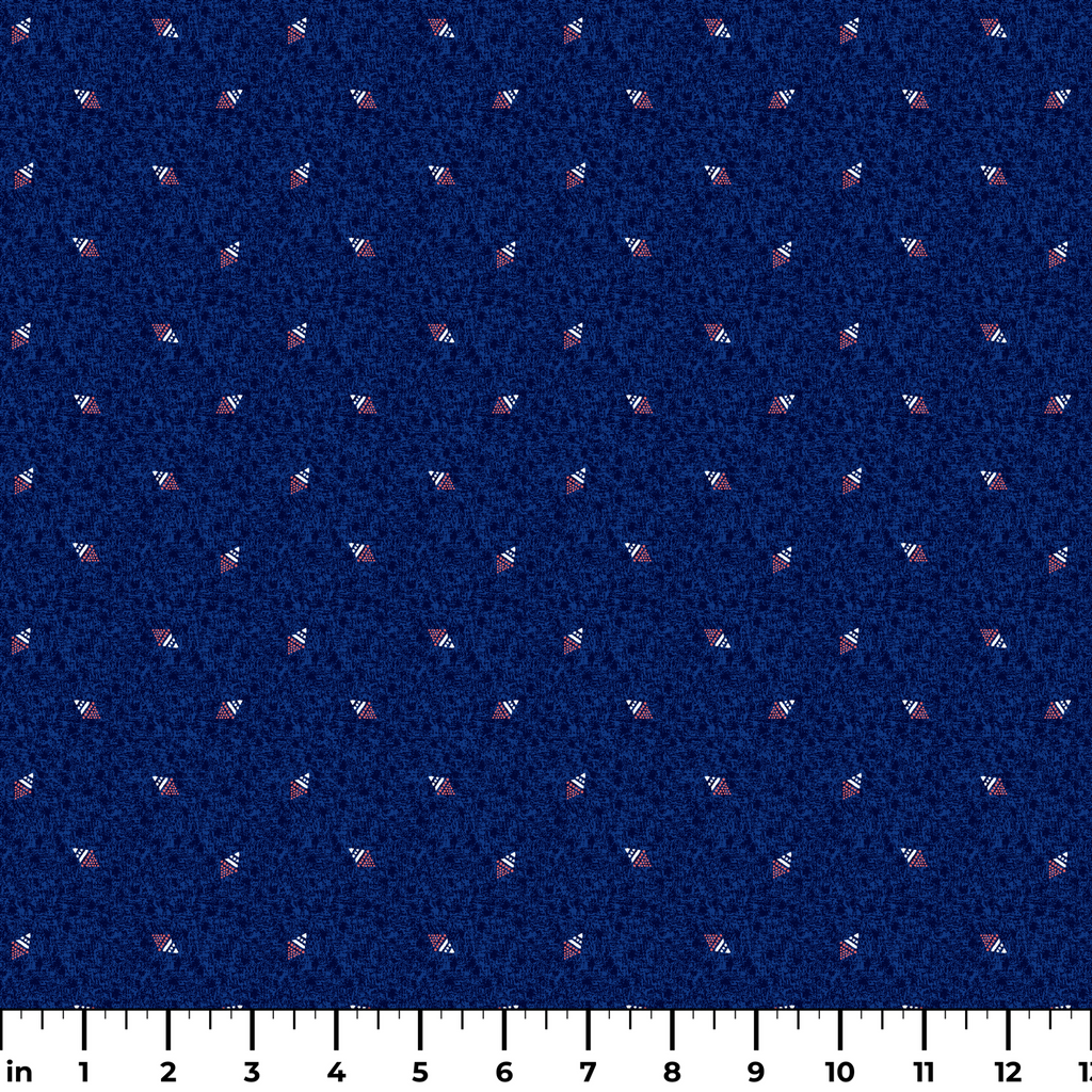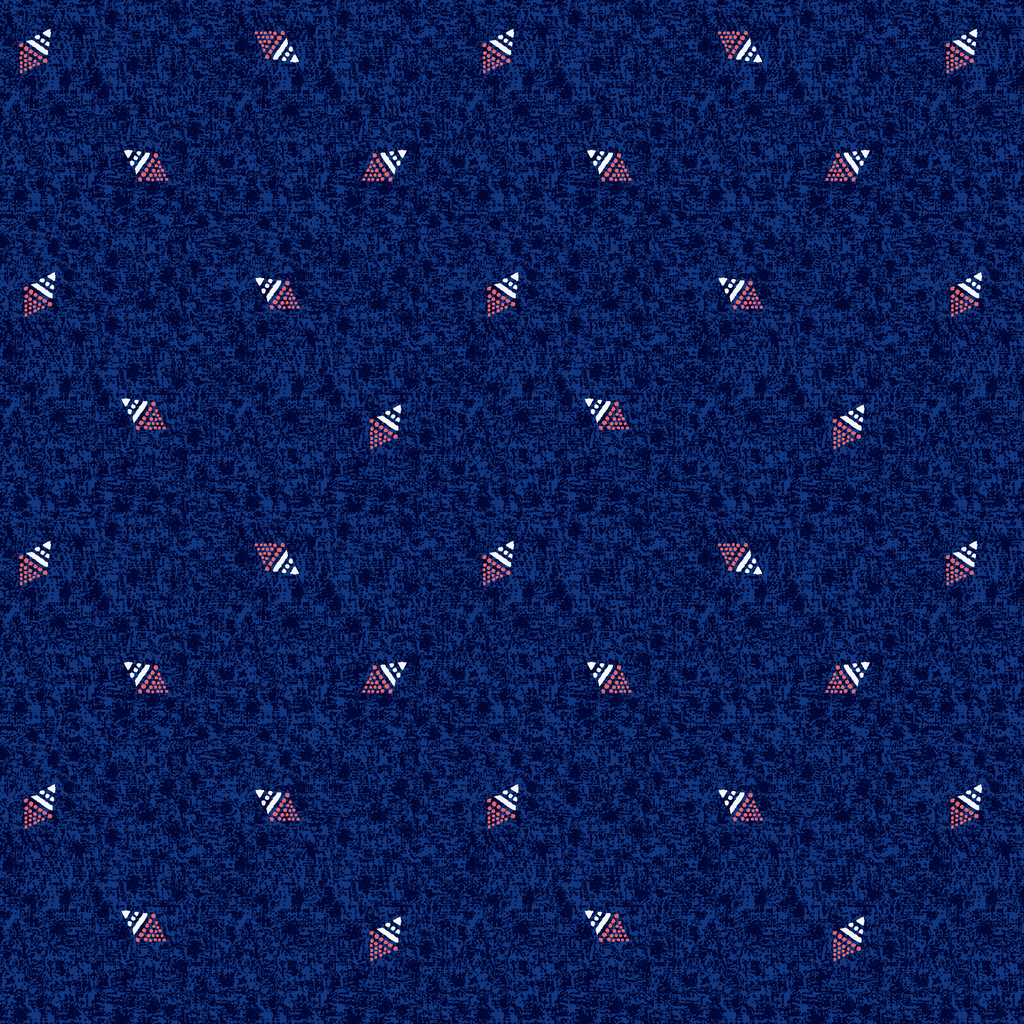 Deep navy blue fabric adorned with scattered geometric triangles in patriotic red, white, and blue creates a subtle yet festive pattern. The textured background resembles denim, while the small triangular motifs pop with their striped and dotted detailing, giving the fabric a modern Americana feel. Perfect for summer quilting projects, table runners, or patriotic holiday decorations where a more understated nod to the flag colors is desired.