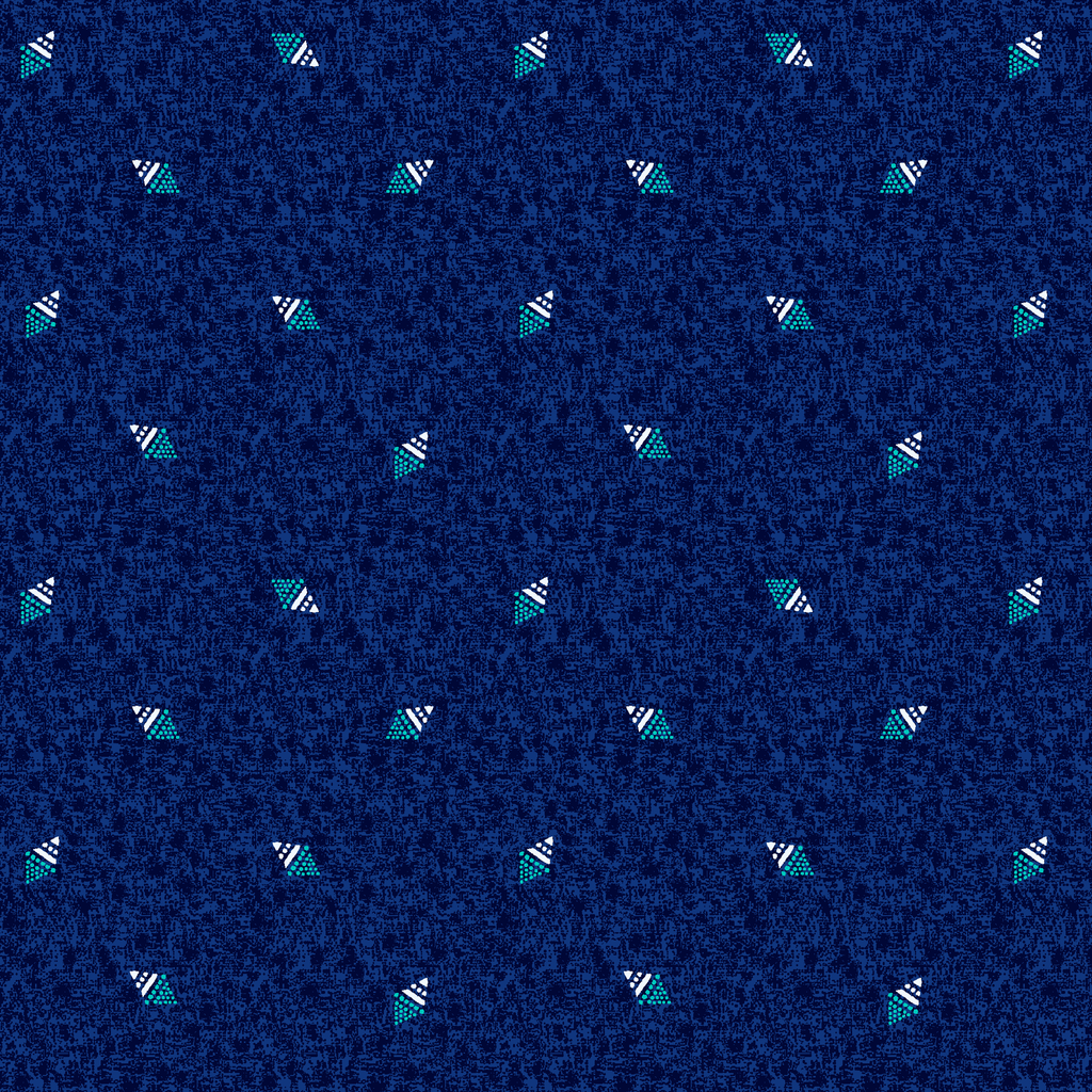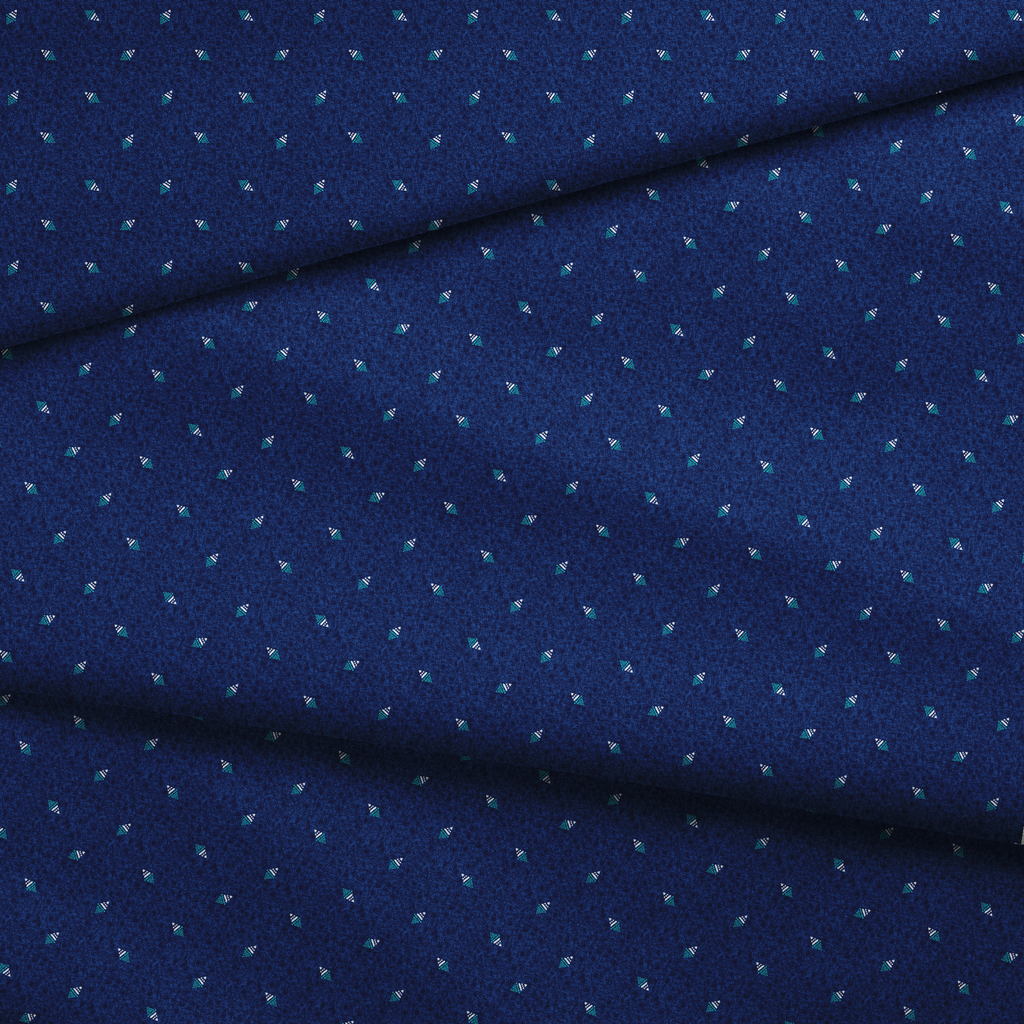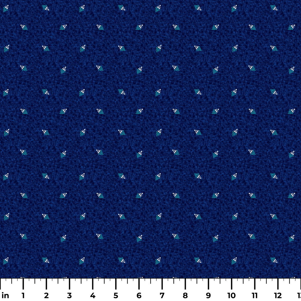 Dive into the depths of midnight blue with this striking fabric featuring scattered geometric triangles in aqua teal and crisp white. The tiny patterned triangles create playful dots across the textured navy background, giving the fabric dimension and movement. This modern maritime-inspired print would be perfect for quilting projects, beach-themed accessories, or casual summer wear that needs a touch of oceanic charm.