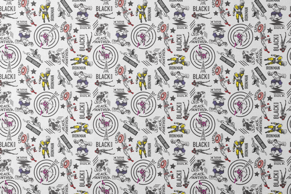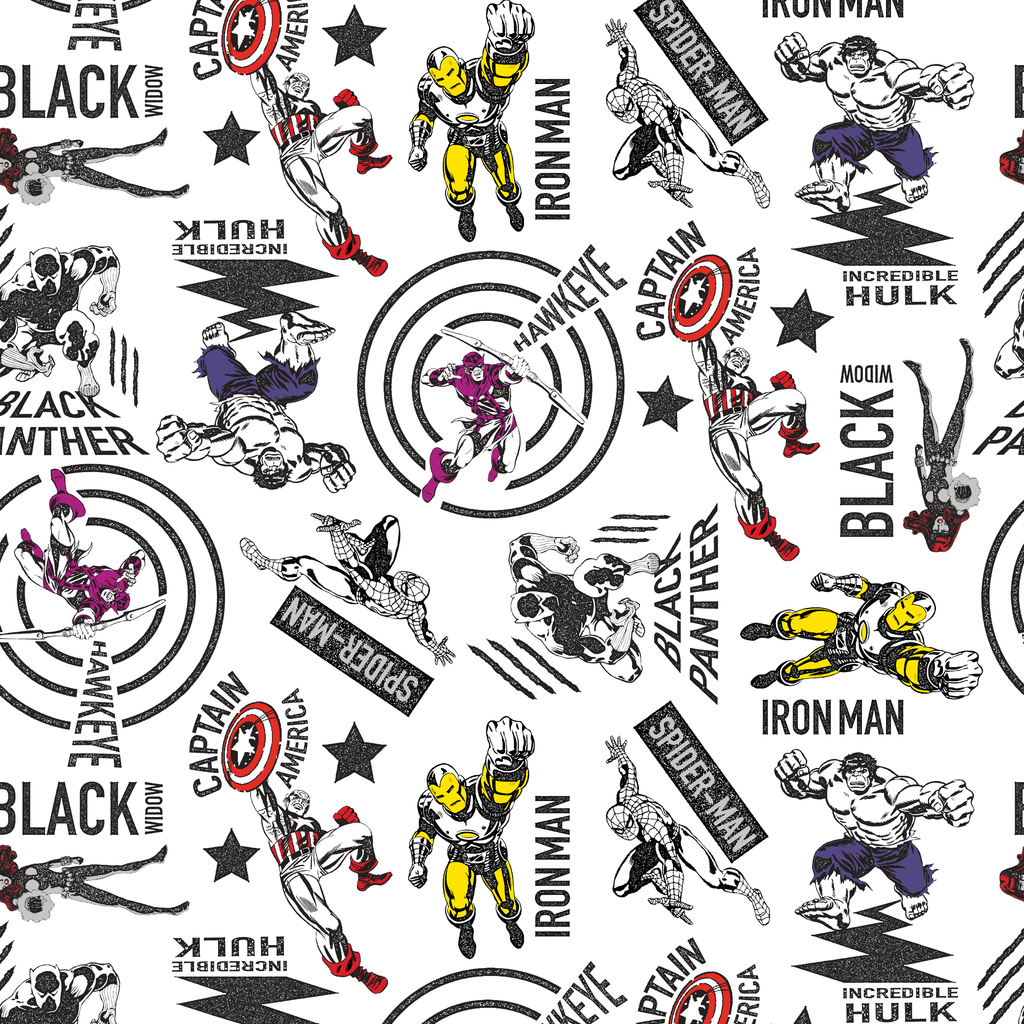 Classic Marvel Super Hero fabric featuring Iron Man, Black Panther, Captain America, and Hulk in a dynamic all-over pattern perfect for fans of vintage comic book characters.