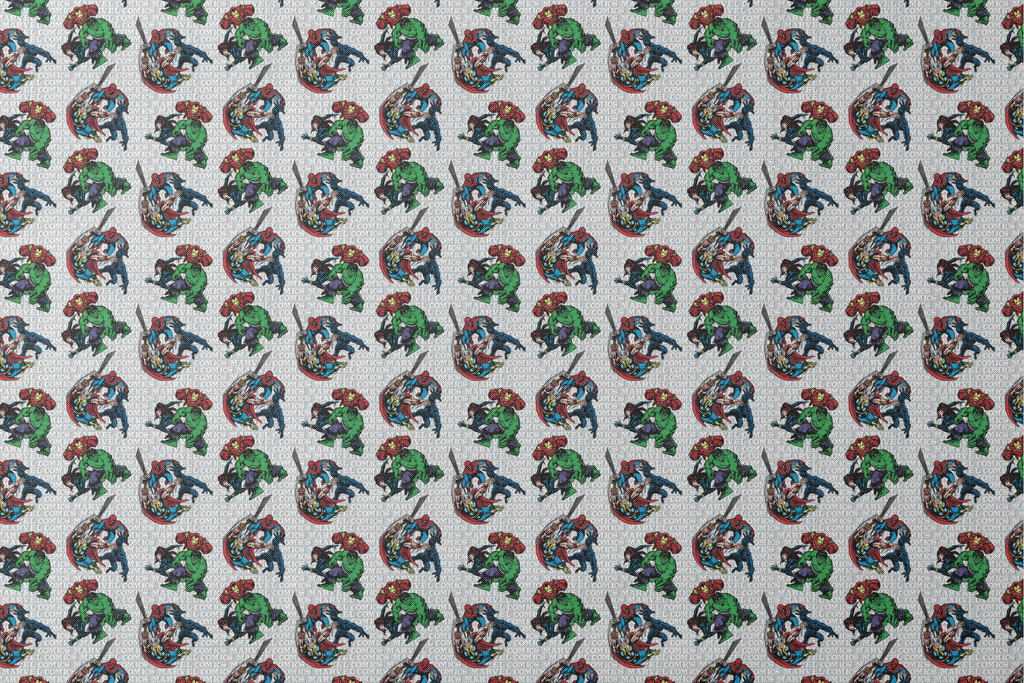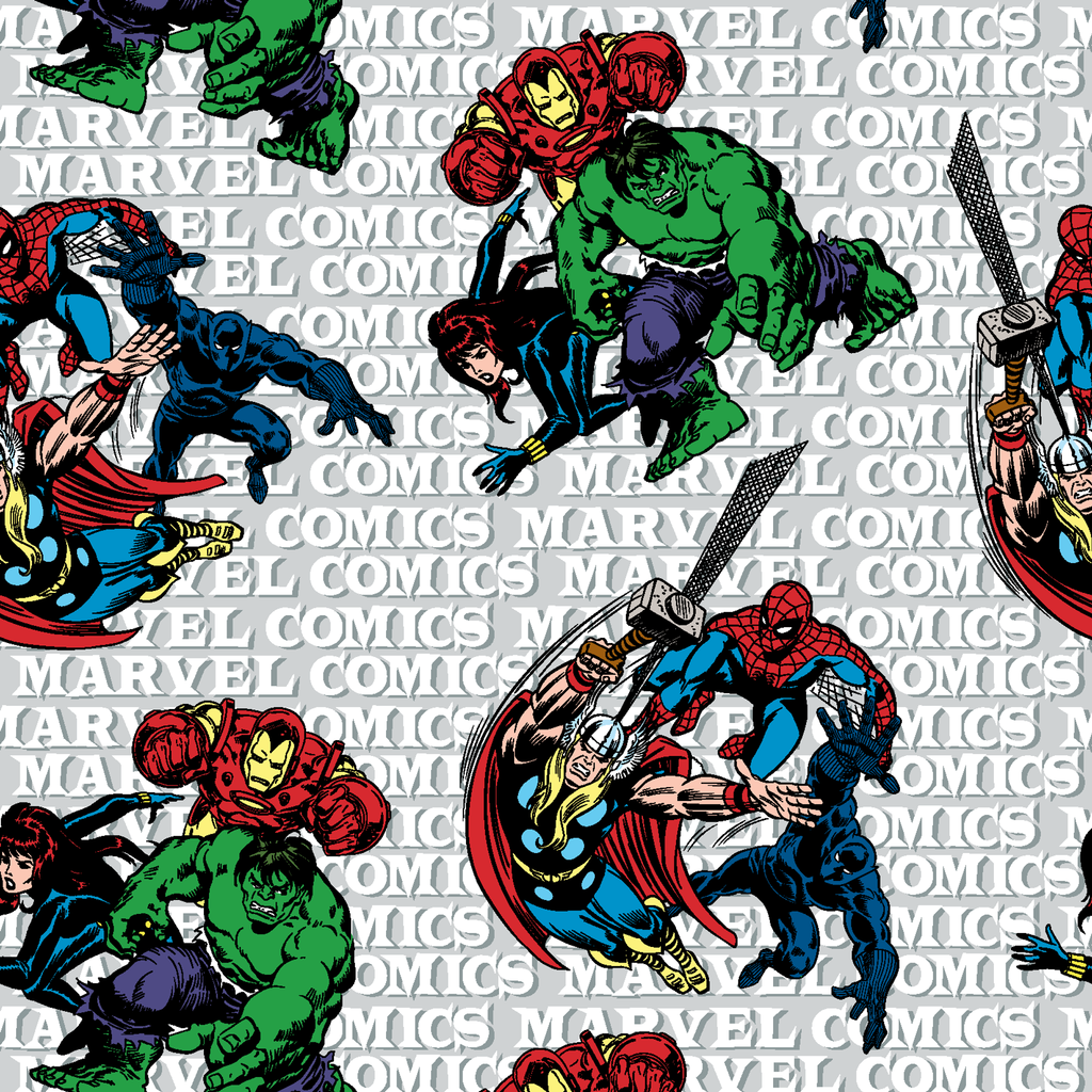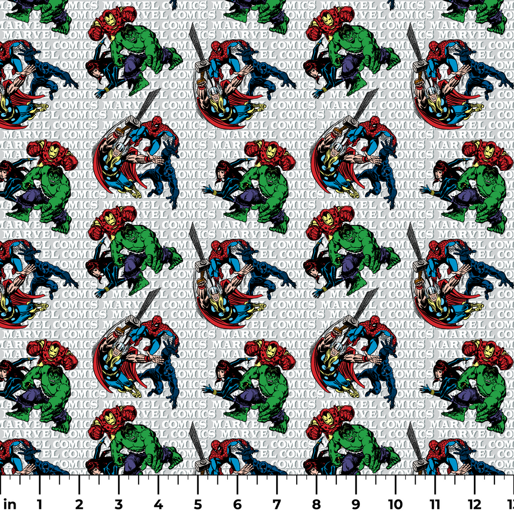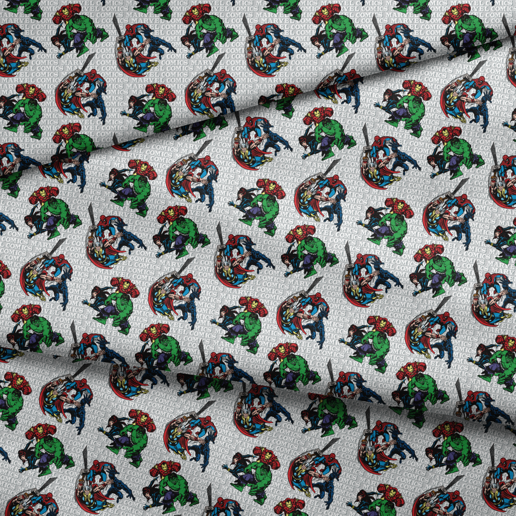 Marvel Comics Super Heroes fabric with Iron Man, Hulk, Captain America, and other heroes in action poses on a text background - perfect for Super Hero fans and comic book collectors.