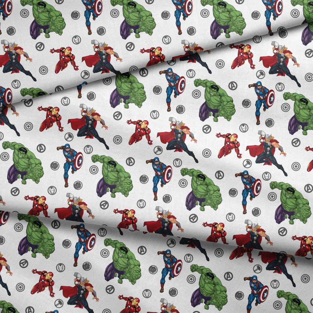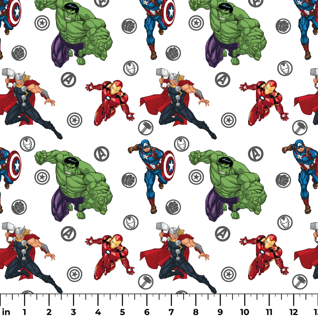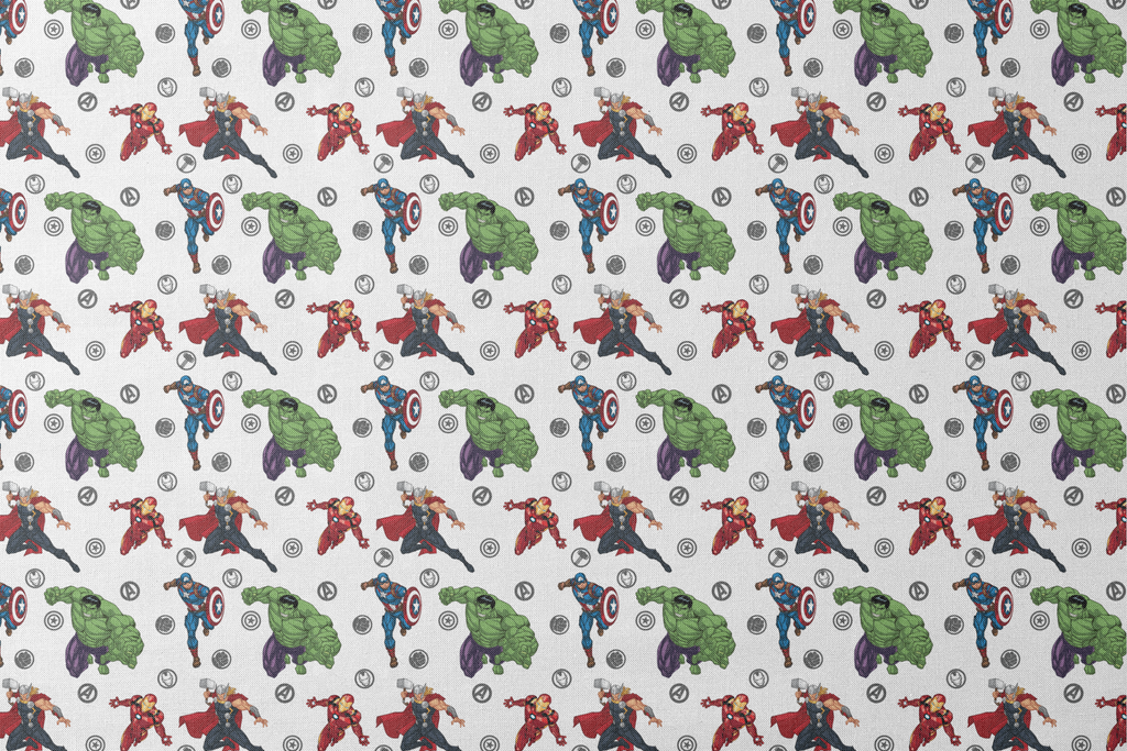 Iconic Marvel Super Heroes pattern featuring Hulk, Thor, Iron Man and Captain America with Avengers symbols on a white background - perfect for fans of comic book action and Super Hero adventures.