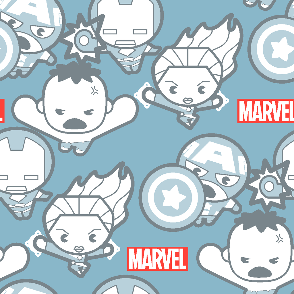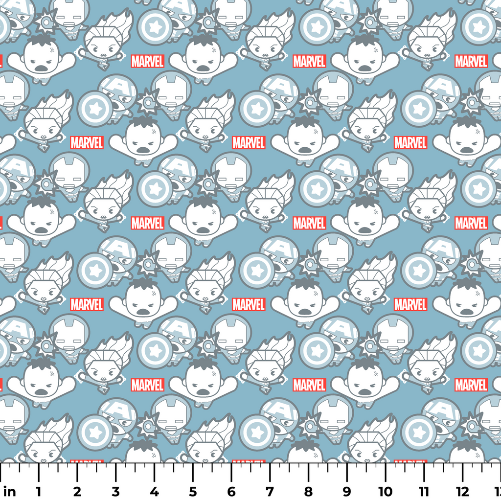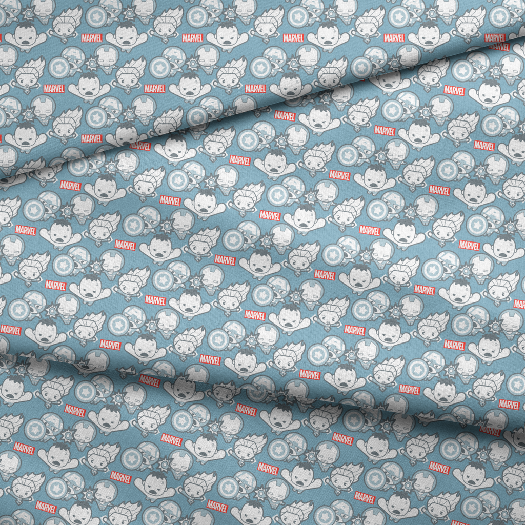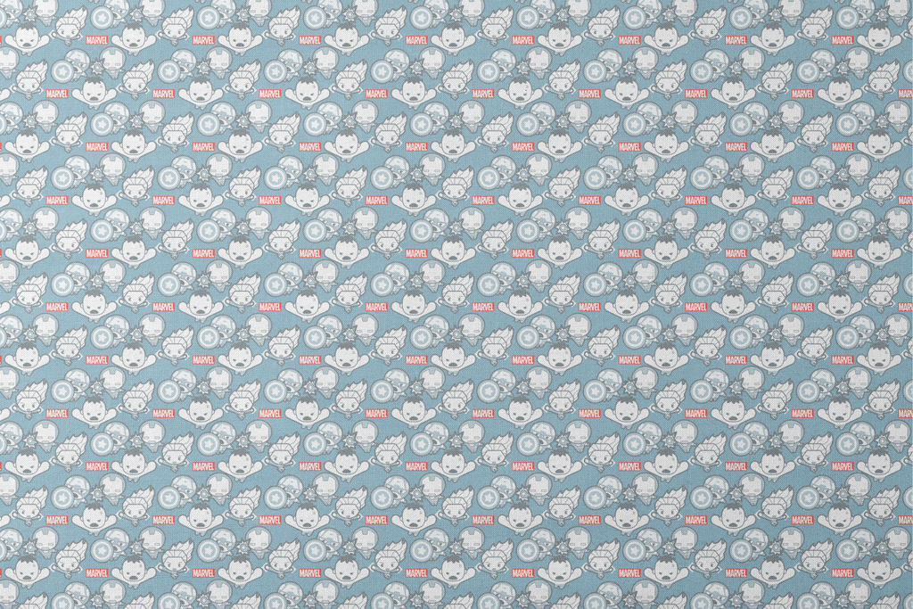 Adorable Marvel superhero cartoon pattern featuring iconic characters with shields, masks, and gear on a light blue background. Perfect for fans of comic book style and modern pop culture.