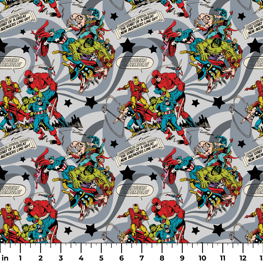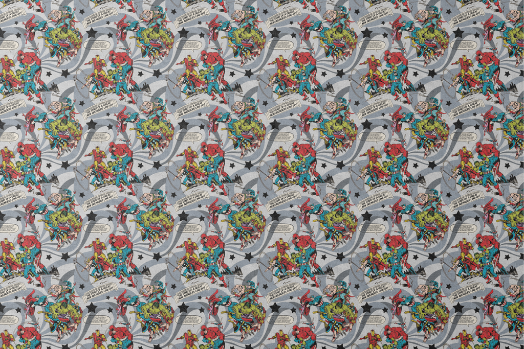 Vibrant retro comic book fabric with Marvel superheroes in action poses against a gray starburst background. Perfect for Super Hero fans and DIY projects.