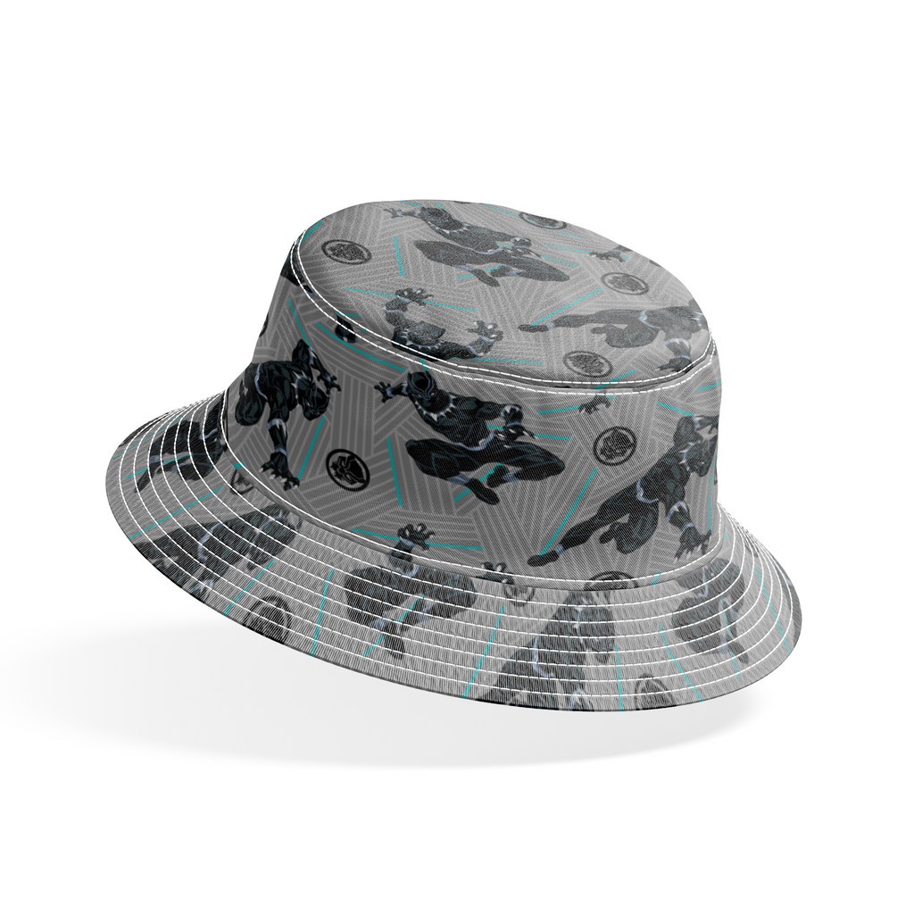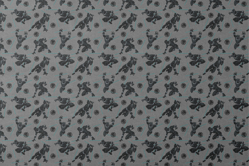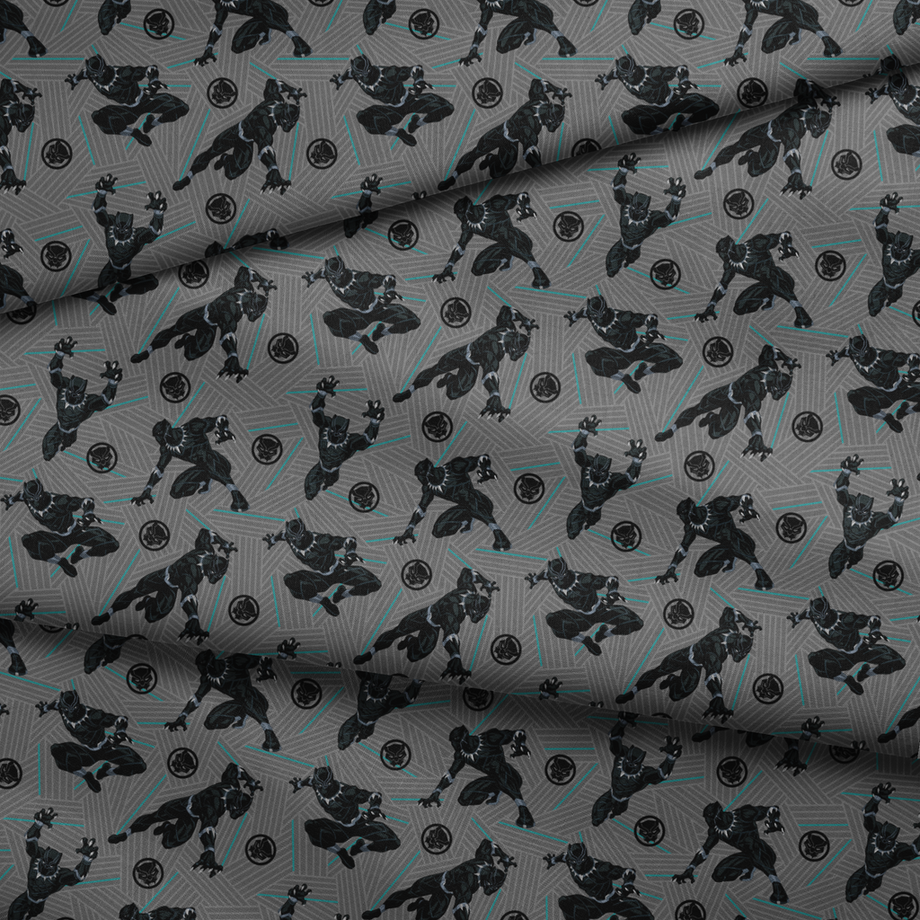 Sleek Black Panther action figures strike dynamic poses against a geometric gray and teal background in this modern, comic-inspired pattern featuring Super Hero motifs.