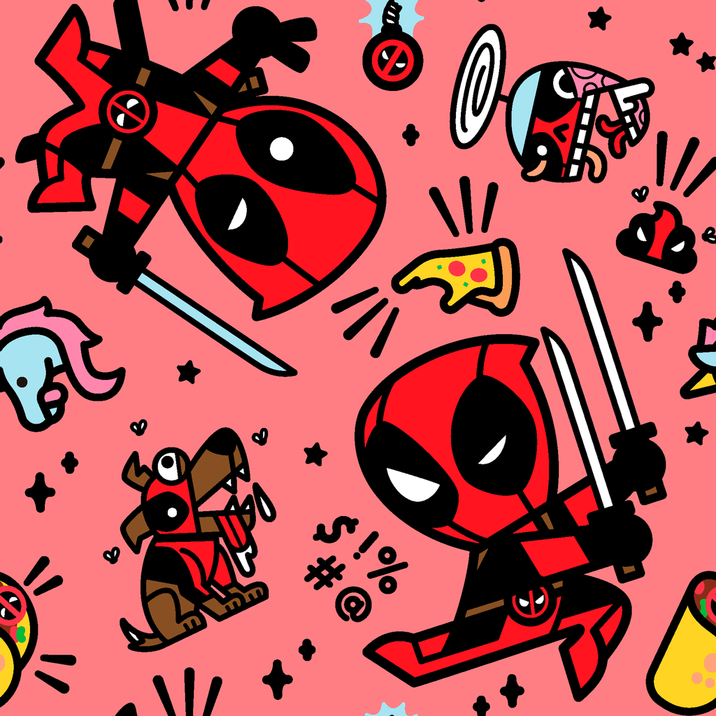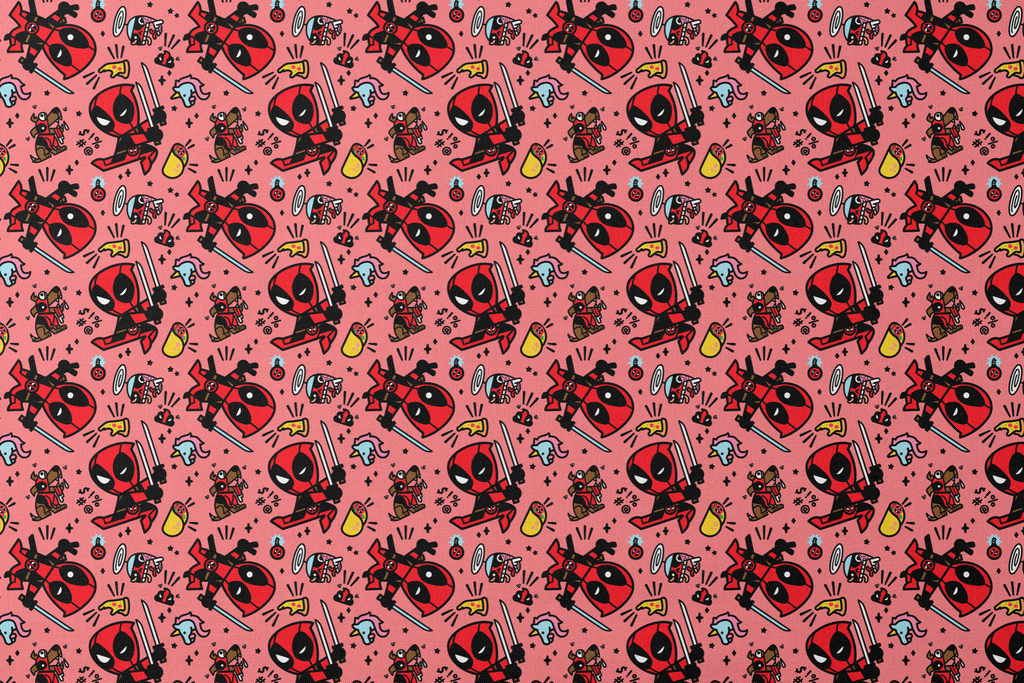 This cute and quirky Marvel Deadpool pattern features chibi-style characters with swords, pizza, Deadpool & Dogpool on a vibrant pink background. Perfect for Marvel fans who love this anti-hero's comedic style.