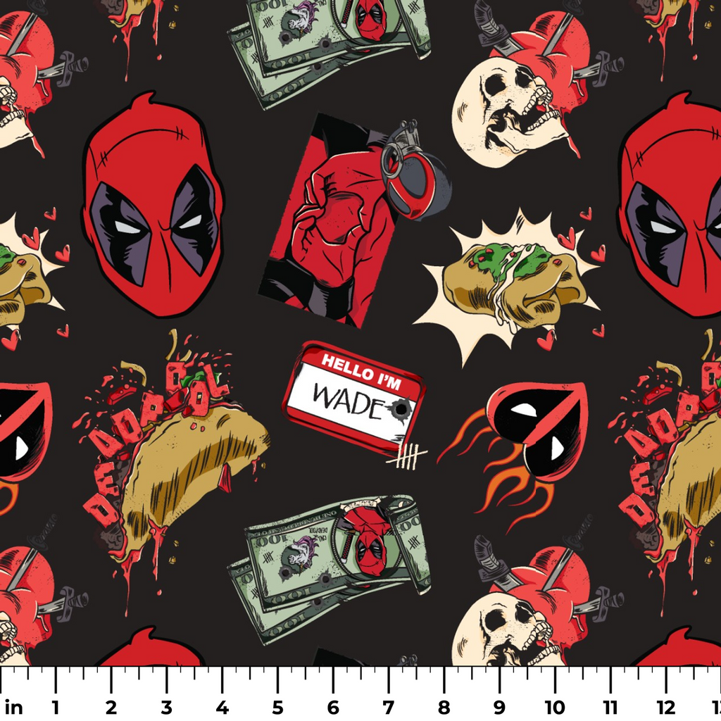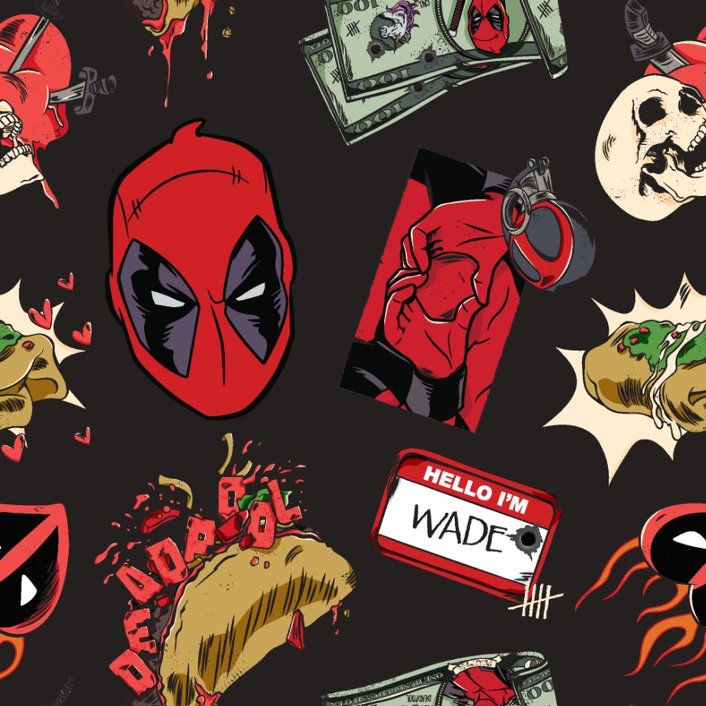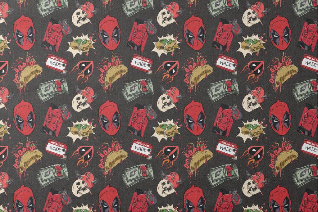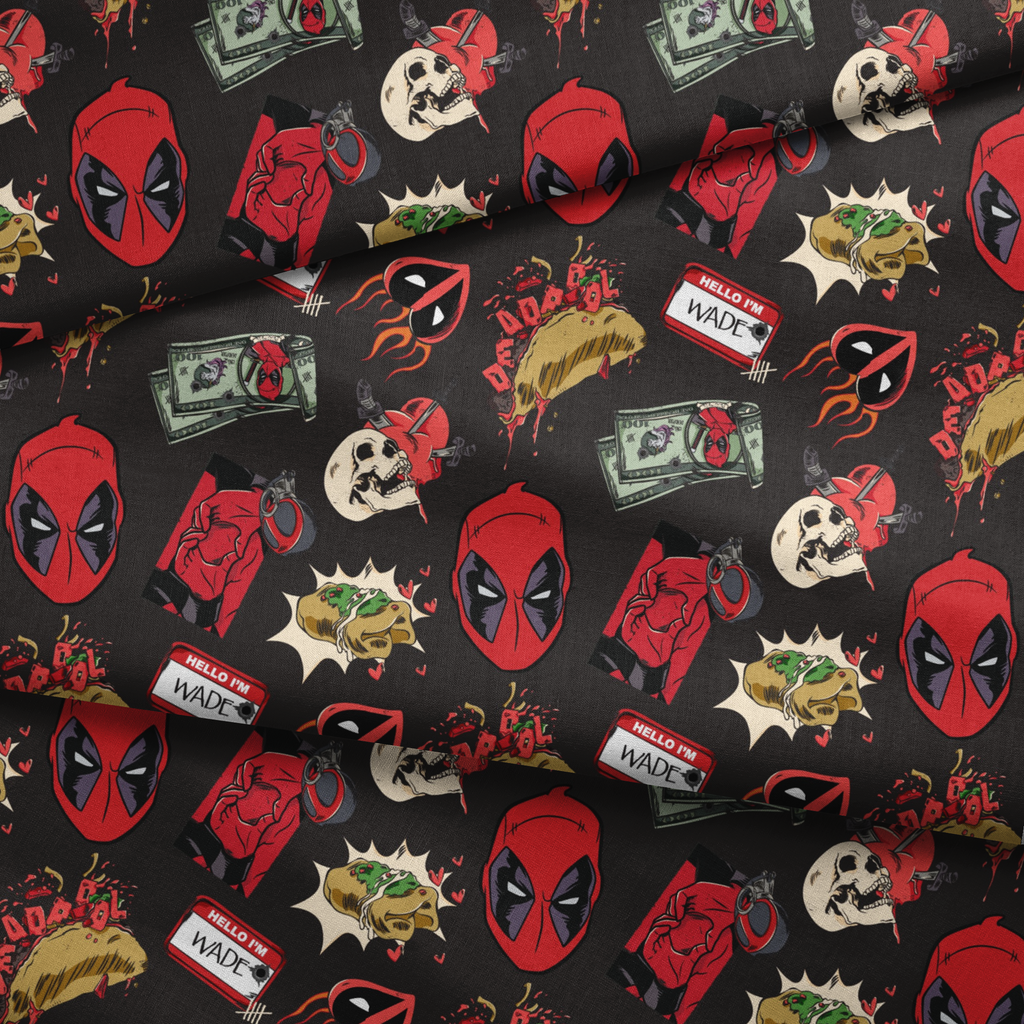 Vibrant Marvel Deadpool pattern featuring iconic red mask, name tag, dollar bills and comic elements on a black background. Perfect for fans of Marvel's irreverent anti-hero.