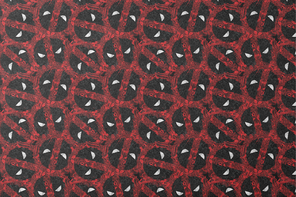 Vibrant red and black graphic pattern featuring multiple Deadpool silhouettes, creating a bold, contemporary design with a modern comic book aesthetic.