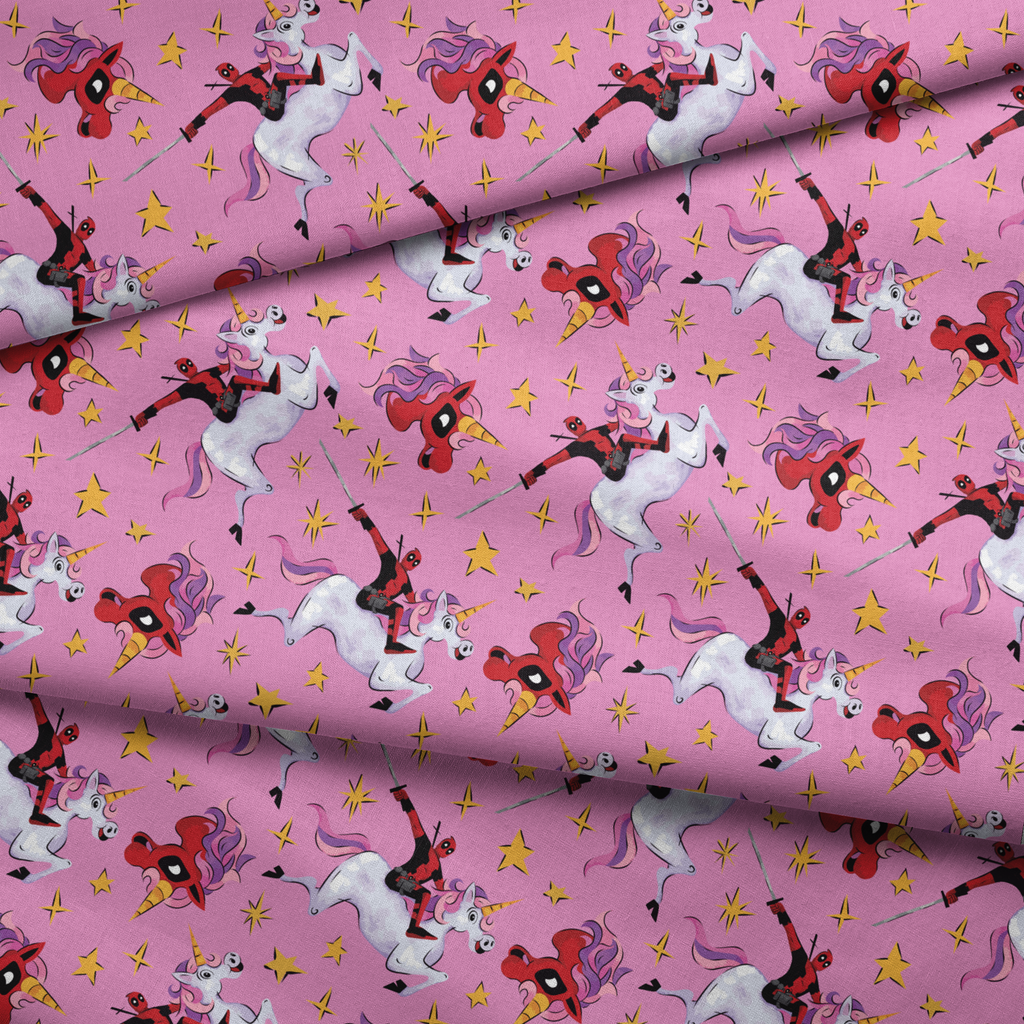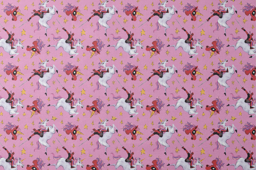 Vibrant purple pattern featuring Deadpool riding white unicorns with colorful manes, scattered with golden stars for a playful, whimsical aesthetic.