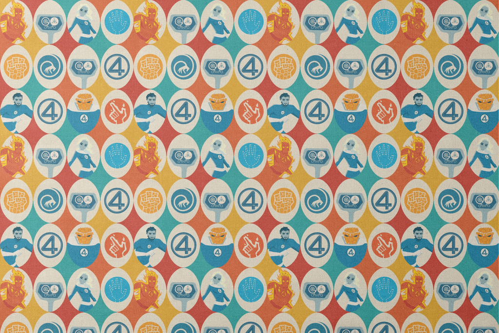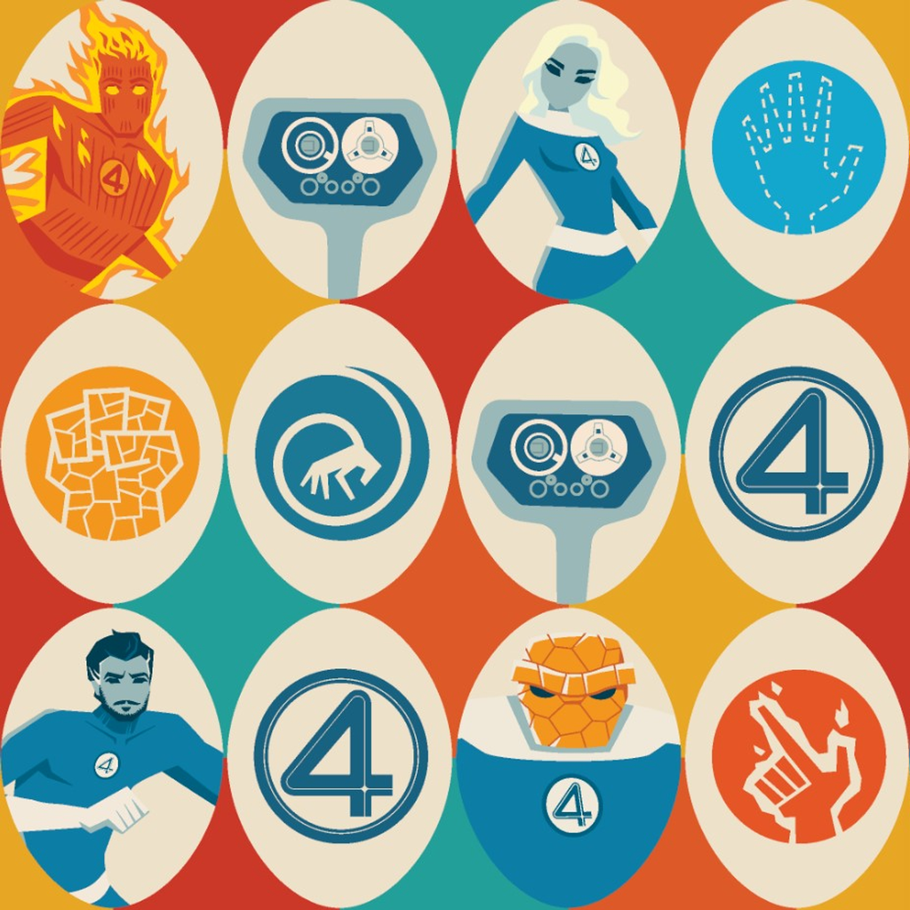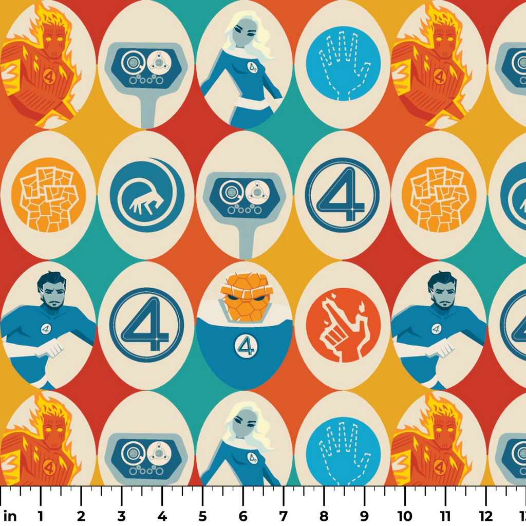 Vibrant retro Marvel Fantastic Four with character icons and logos in bold orange, teal, and yellow circles, capturing the vintage comic book aesthetic.